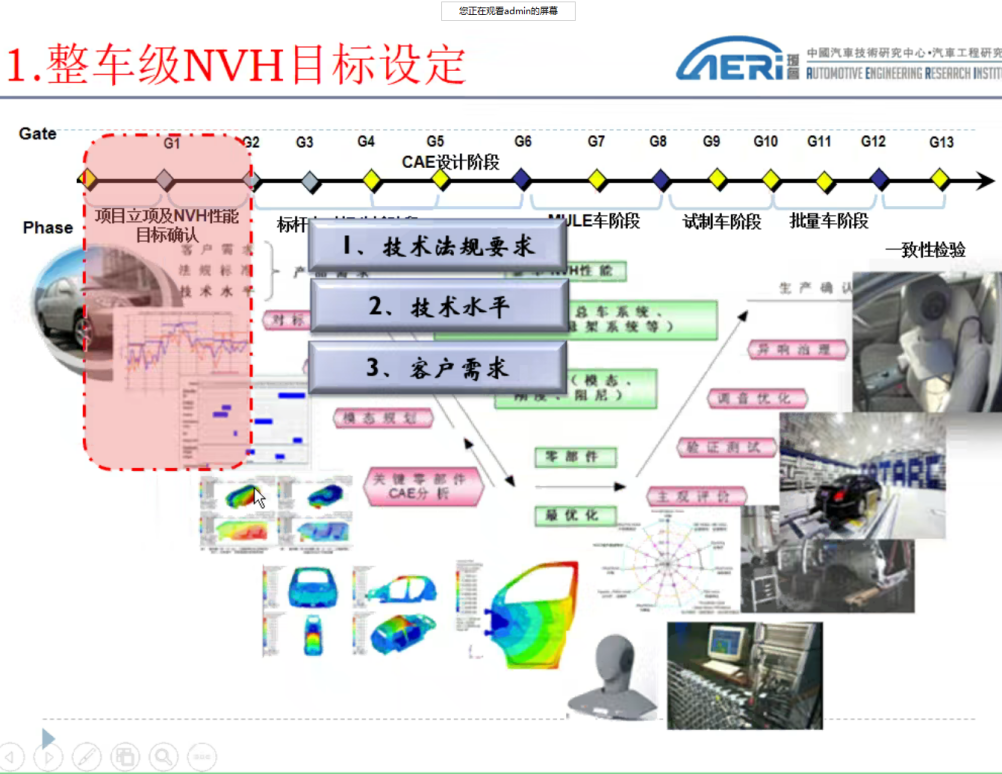 首先,李洪亮教授从整车开发项目开始讲解,介绍了整车开发项目从战略规划到SOP开发,周期一般需要2~4年,其中包含造型设计、工程设计、试验验证等各个方面。随即围绕整车开发关键性能需求,提出了正向开发技术研究的重要性与正向开发的整个流程。从而提到了性能集成开发的必要性,集成开发的内容包括行人保护、操作平顺性、碰撞安全、NVH、热管理等几个方面。并结合工程实例,从安全、振动噪声、疲劳耐久、空气动力学等几方面分析当前研究的热点及研发挑战。他以振动噪声正向开发为例,介绍正向开发的过程及注意事项。讲到NVH性能目标设定的时候,指出了对标实验的目的:1.通过对标实验,设定项目的整车级和零部件级的NVH性能目标,成为整个车型开发过程的NVH性能判断之一;2.全面剖析标杆车的优缺点,为开发过程提供借鉴。最后,李洪亮教授提到了未来汽车的发展方向即电动化、智能化、网联化、共享化、轻量化,每一部分都配有工程图,流程图,对学员们的理解起了非常大的帮助,使授课的知识变得极其直观,给学员们留下了深刻的印象。