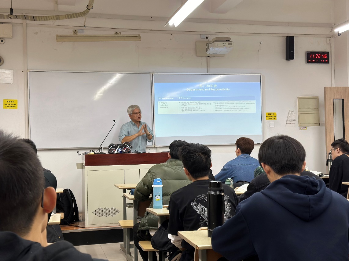 为充分发挥产业优势和企业协同育人作用,进一步深入推动汽车电子课程的产教融合实践与探索,3月25日,汽车工程系邀请威柏电子技术总监钟保荣先生走进课堂,为车辆工程专业大三学生讲授“汽车电子”专业课。