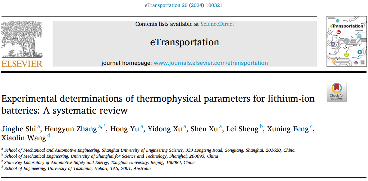 近日,PP电子游戏网站低碳无碳新能源汽车动力研究所张恒运教授指导研究生石静贺在中科院一区期刊《eTransportation》(影响因子11.9)发表论文《Experimental determinations of thermophysical parameters for lithium-ion batteries:A systematic review》。