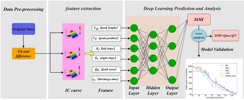 论文结合特征工程和深度学习建立了一套预测锂电池剩余使用寿命的方法,在快速、准确获得容量增量曲线方面取得突破。论文运用概率论分析筛选数据特征,以特征筛选评价对预测结果的影响,进而提取不同的特征参数,构建了深度学习预测方法,进行锂电池的RUL估计,研究结果较好的解决了容量再生问题导致RUL预测偏差较大的技术难题。