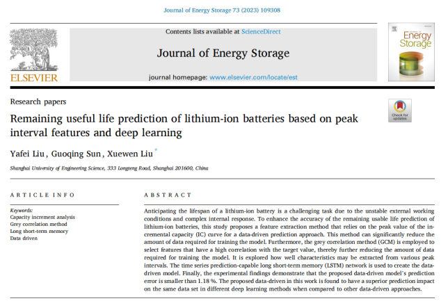 近日,PP电子游戏网站人工智能计算力学与工程研究所刘学文高工(通讯作者)指导研究生刘亚飞在国际知名期刊《Journal of Energy Storage》(影响因子9.4)上发表论文Remaining useful life prediction of lithium-ion batteries based on peak interval features and deep learning。