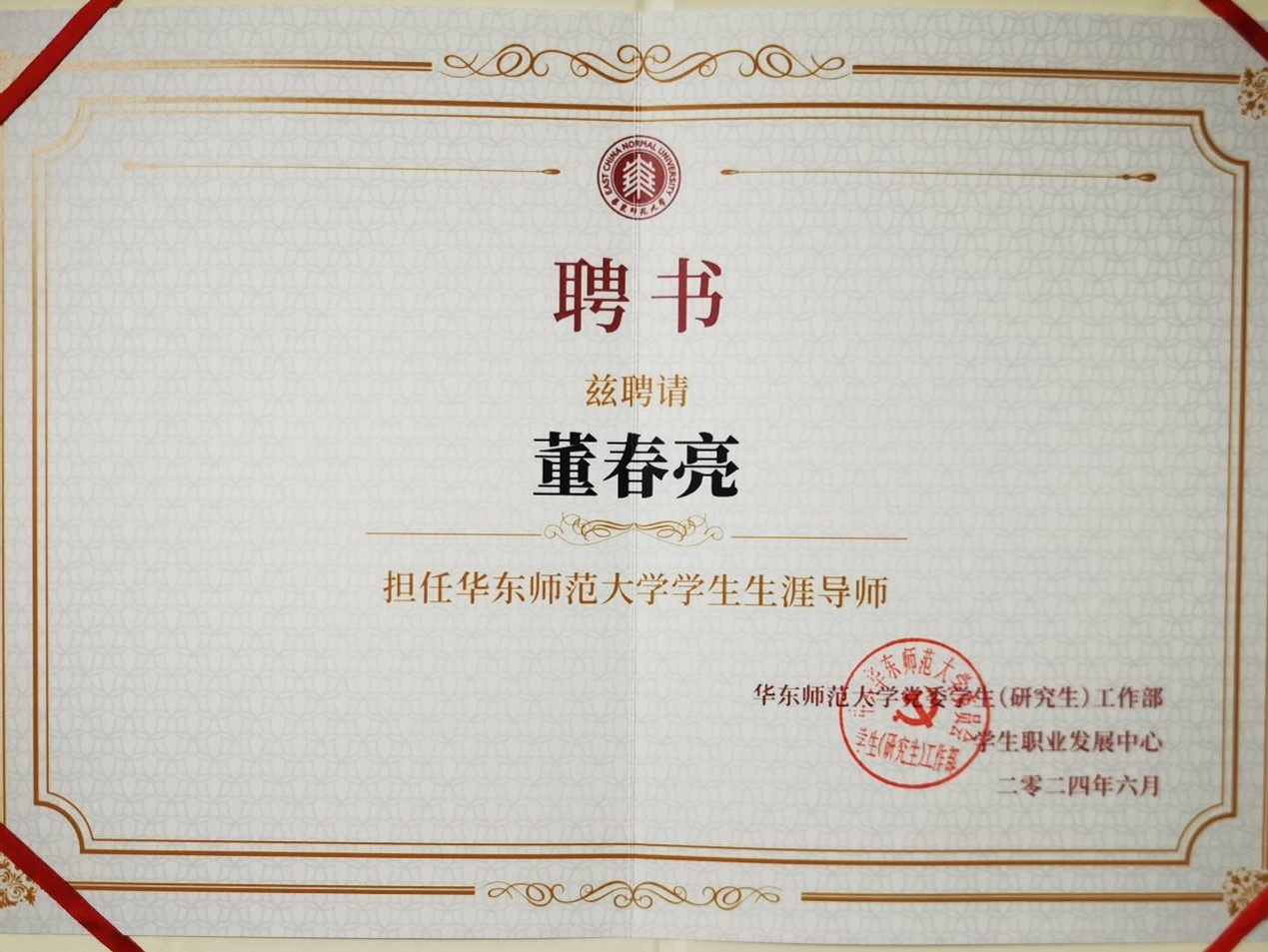 会上,主办方为董春亮老师颁发了华东师范大学学生生涯导师聘书。