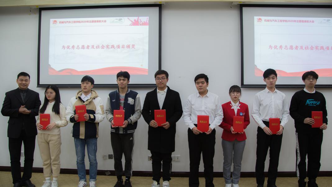 会上,谢腾骁老师总结了学院一年来志愿服务工作取得的成绩。他指出,在新冠肺炎疫情防控的特殊背景下,学院的志愿服务工作呈现新特点、取得新发展。2020年,我院有712名学生参与志愿服务,累计时长达9571小时。大会共表彰12个先进个人,5支优秀团队,涵盖疫情防控服务、迎新服务、进博会服务、献血服务、垃圾分类等多个领域、多个项目,充分展现了机械与汽车学子的良好精神风貌,受到社会各界的一致好评。王东阳老师为优秀志愿者及优秀社会实践项目颁奖,向他们表示祝贺及鼓励。