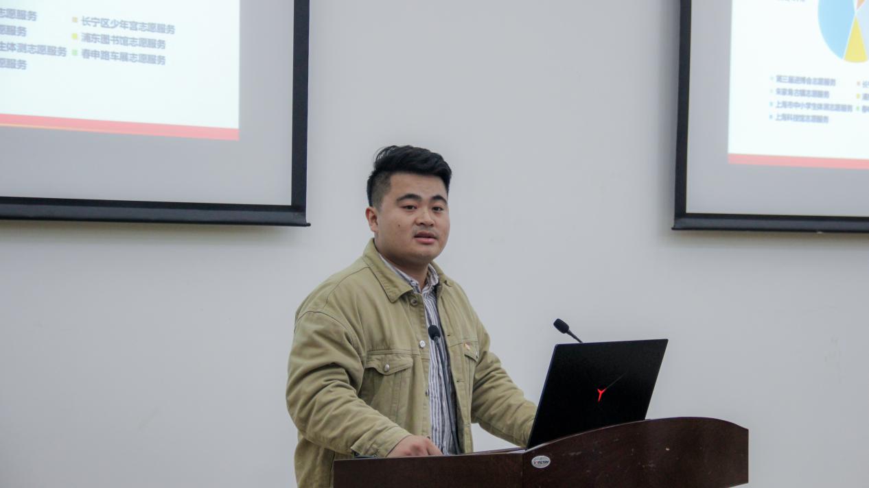 王东阳副书记讲话,对志愿者取得的成绩给予充分肯定,他提出本次表彰大会不仅是总结大会,更是一场爱的交流。他强调,参加志愿服务要与人才培养目标相结合,要与专业特色相结合,要与学院发展目标相结合,要积极引导同学们加入志愿服务队伍,为学校、为上海、为国家注入青春力量。王东阳副书记还对我院志愿服务工作提出三点希望,一是要把坚定的政治方向放在首位,要勇担中华民族伟大复兴的责任与使命;二是要在奉献中实现人生价值,个人价值要与社会价值一脉相承,要在服务他人、服务社会中自我实现;三是要完善志愿者服务有效运行的长效机制,加强顶层设计,做大做响志愿者服务品牌,为学院实践育人注入不竭动力。