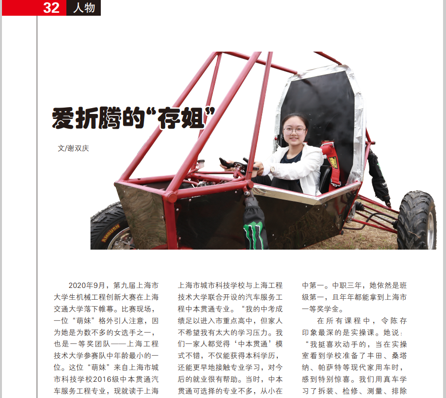 着力内外联通,双向打破长学制培养兴趣衰减的“隐忧”。“实训楼里的汽车是真的汽车,不是模拟汽车。”一说到实训,陈存就兴奋起来。“这种实操,无论到大学还是社会上,真正拆解汽车里零部件的机会都是很少的。”陈存说,实操的前提是需要理论知识的,但是如果纯学理论,就比较枯燥。理论和实际动手相结合,我觉得十分有趣,看到实物后更方便理解,更容易记忆。中本贯通汽车服务工程专业精心设计开发了“汽车文化之旅”考察活动。这一被师生戏称为“北上南下逐鹿中原”的专业认知活动,通过学生们辗转长春、沈阳、北京三地,进车企、下车间,看展馆、听讲解,了解汽车历史文化,把握汽车发展动态,学习汽车专业知识。“我曾经到东北沈阳参观了华晨宝马的生产流水线,这增加了我对专业的感性认识。”陈存说。