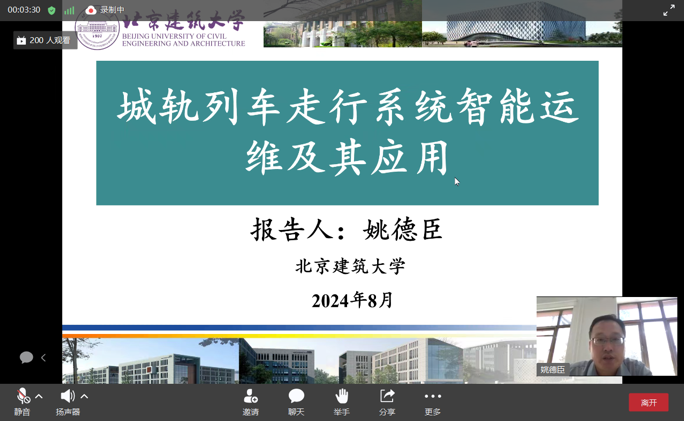2024年8月27日下午14:00,通过华为云会议视频平台,北京建筑大学机电与车辆工程学院姚德臣教授为暑期学校作题为《城轨列车走行系统智能运维及其应用》的线上专题讲座。本次讲座由PP电子游戏网站院长方宇教授主持。