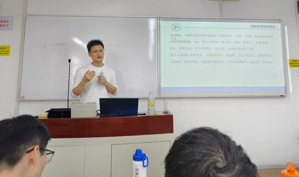 韦老师给同学们讲解了开环控制和闭环控制的基本概念,介绍了传感器的各项重要参数,并结合实际案例,详细介绍了常用控制器(如PLC、嵌入式系统、和工控机)的优缺点,分析了如何根据具体项目需求选择合适的控制器,并分享了实际工程中的应用经验。韦老师通过亲身经历分享了机器视觉技术在冷轧钢卷生产线上的应用,展示了如何利用机器视觉对生产线进行监控,实现生产线的自纠错,确保生产线平稳运行,强调了其在现代工业中的重要性。