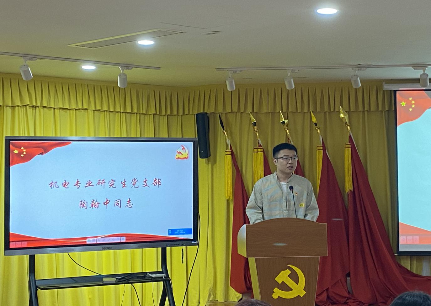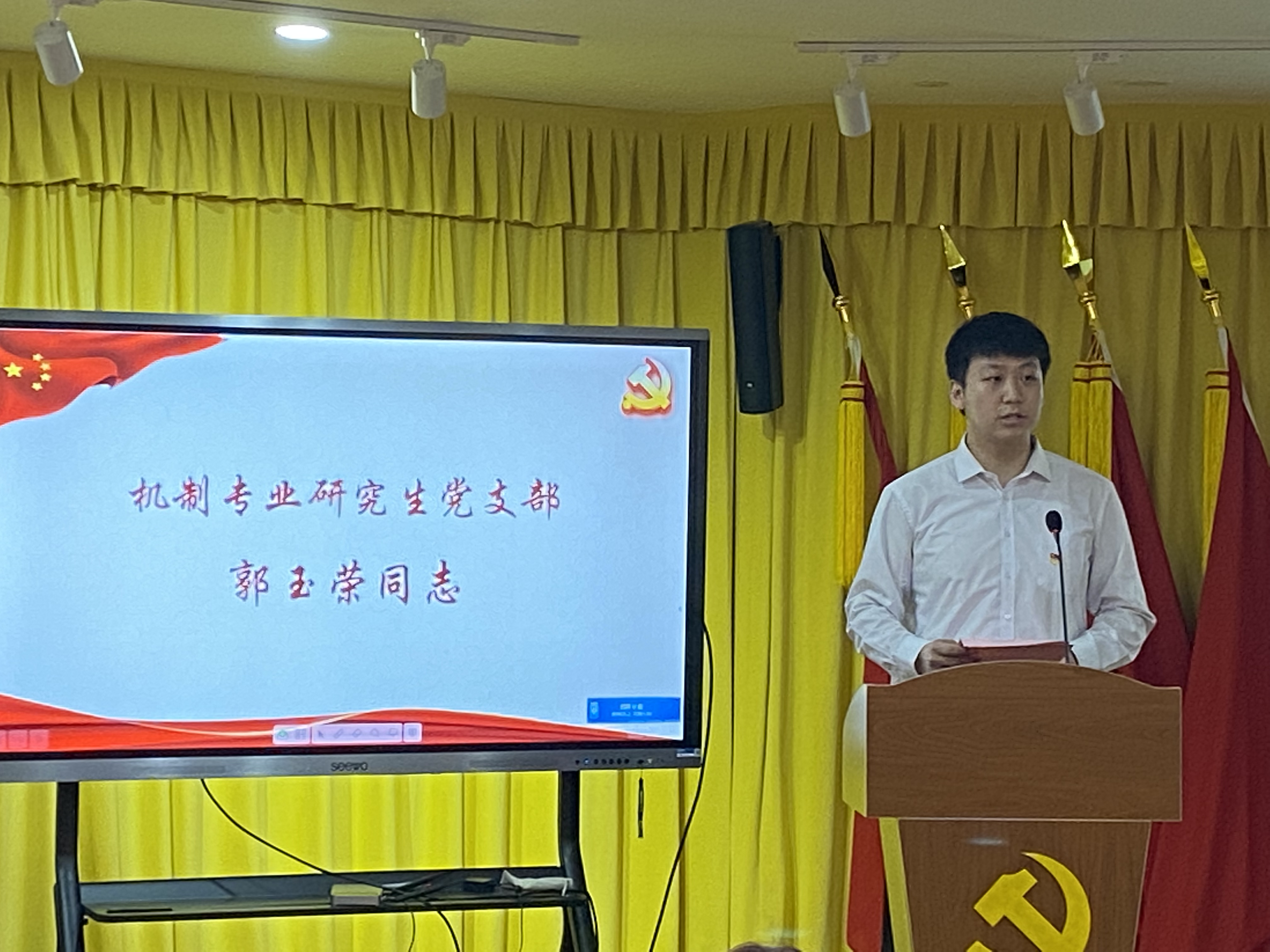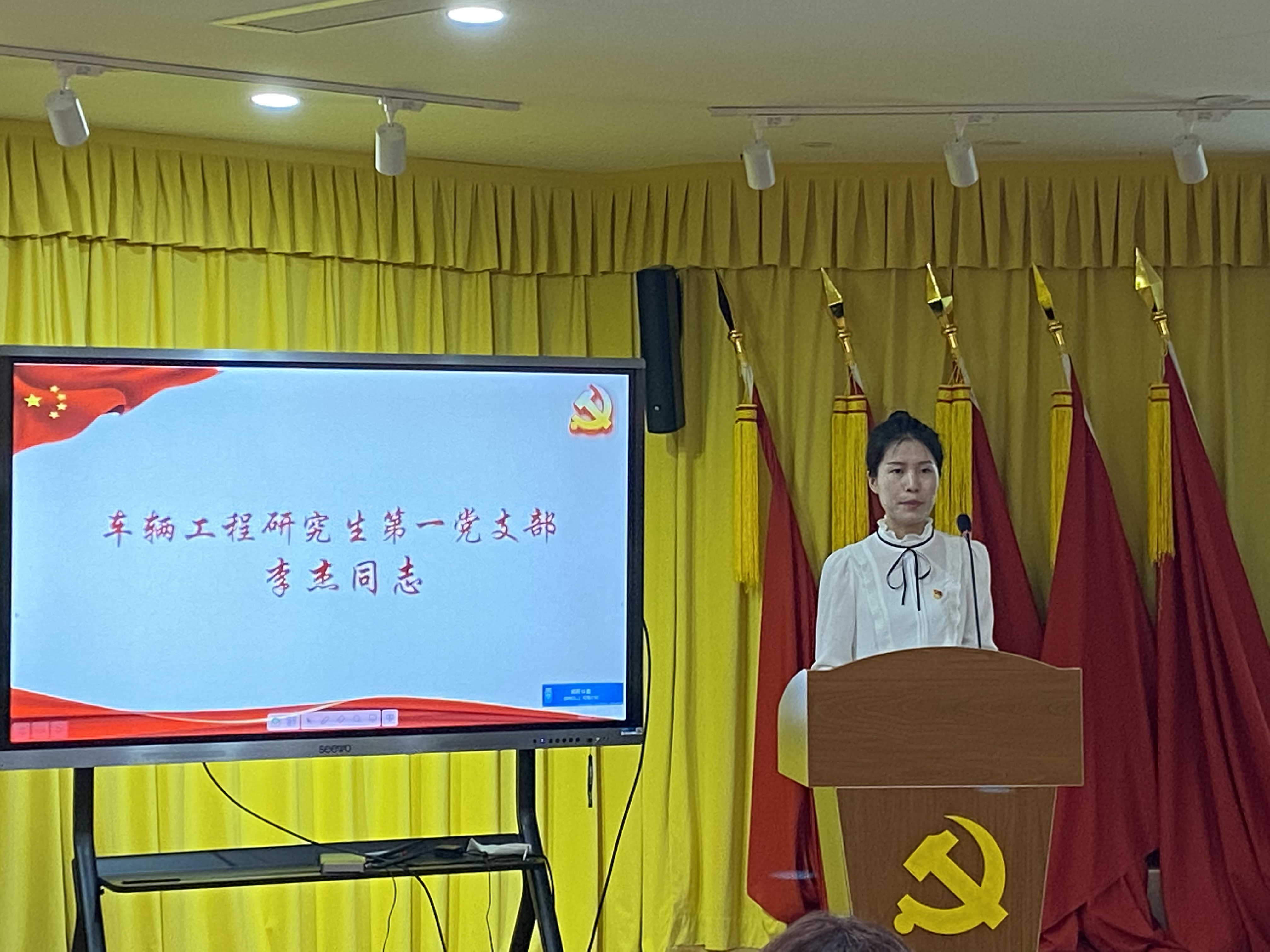 践行使命担当,激扬青春力量。机电专业研究生党支部书记陶翰中作为毕业生代表发言,他以“知行合一,贡献青年力量”为题,讲述青年一代要在实践中接受检验,在担当作为中得到体现,表示在今后将继续牢记党员身份,用行动去践行入党誓言。来自机制专业研究生党支部的郭玉荣和车辆工程研究生第一党支部的李杰,作为研究生标兵代表,鼓励新时代青年要用钉钉子的精神,敢于追梦,不忘初心使命,砥砺前行。