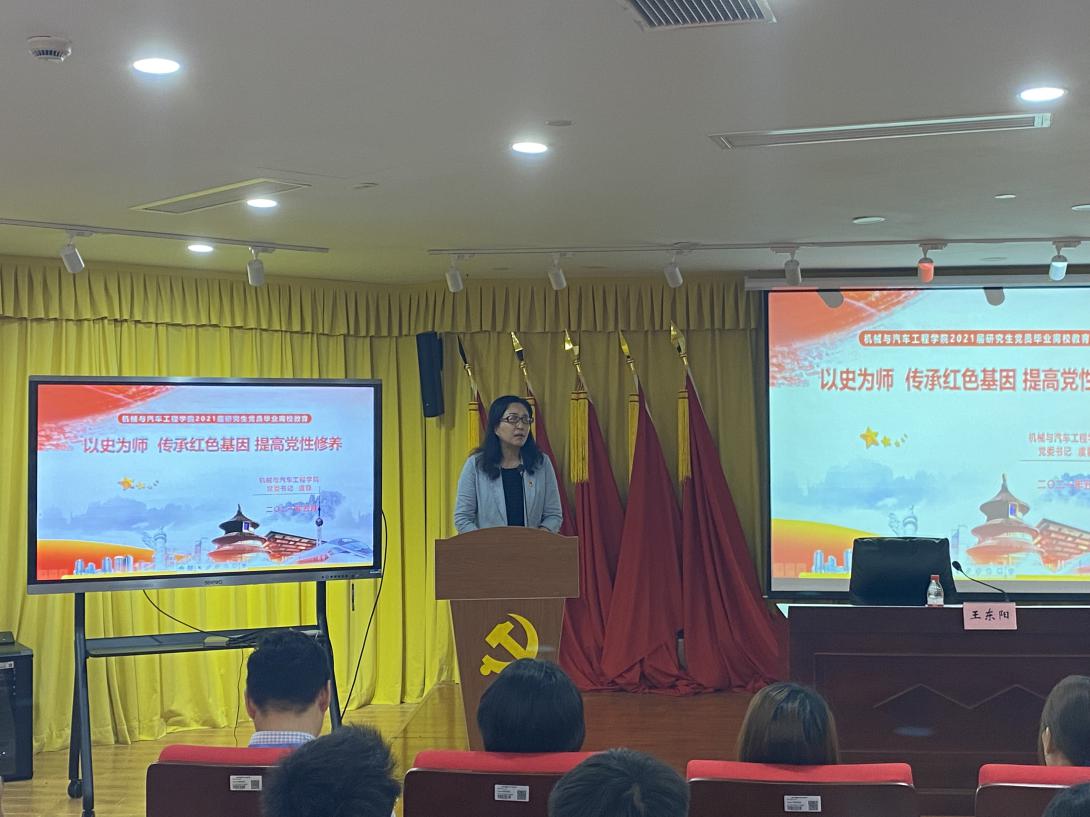 书记上党课,从党史中汲取前进方向。虞蓉书记为毕业生党员讲授“以史为师 传承红色基因 提高党性修养”主题党课,立足“回顾百年辉煌党史”、“深刻理解党史中的优良传统作风和红色基因”、“在党史教育中汲取党性修养的智慧践行新自觉”等三方面内容,引用周恩来《我的修养要则》和陈云《怎样做一个共产党员》与毕业生一起探讨如何加强党性修养,如何践行使命担当。希望毕业生党员始终按照党员的标准严格要求自己,牢记“勤奋、求是、创新、奉献”的校训和“人为本、德为先、学为精、行为要”的院训精神,在人生新的起点上,坚定信仰信念,放飞青春梦想,谱写新时代华章。