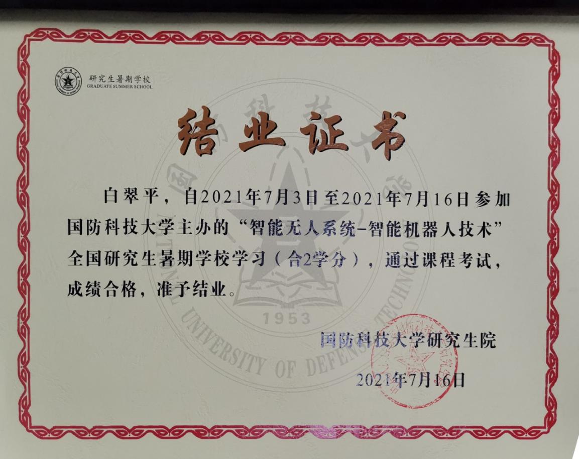 2021年7月3日-7月16日,经过个人携论文申报、主办单位严格遴选、导师指派,我院2019级研究生白翠平和2020级研究生朱蒙参加了由国防科技大学智能与科学学院主办的2021年“智能无人系统-智能机器人技术”全国研究生暑期学校。来自中科院精密测量院、北京航空航天大学、北京理工大学、大连理工大学、厦门大学、吉林大学等全国各地40余所高校的76位控制科学与工程以及机械工程学科的博士、硕士研究生和本科生参加了此次学习、培训。