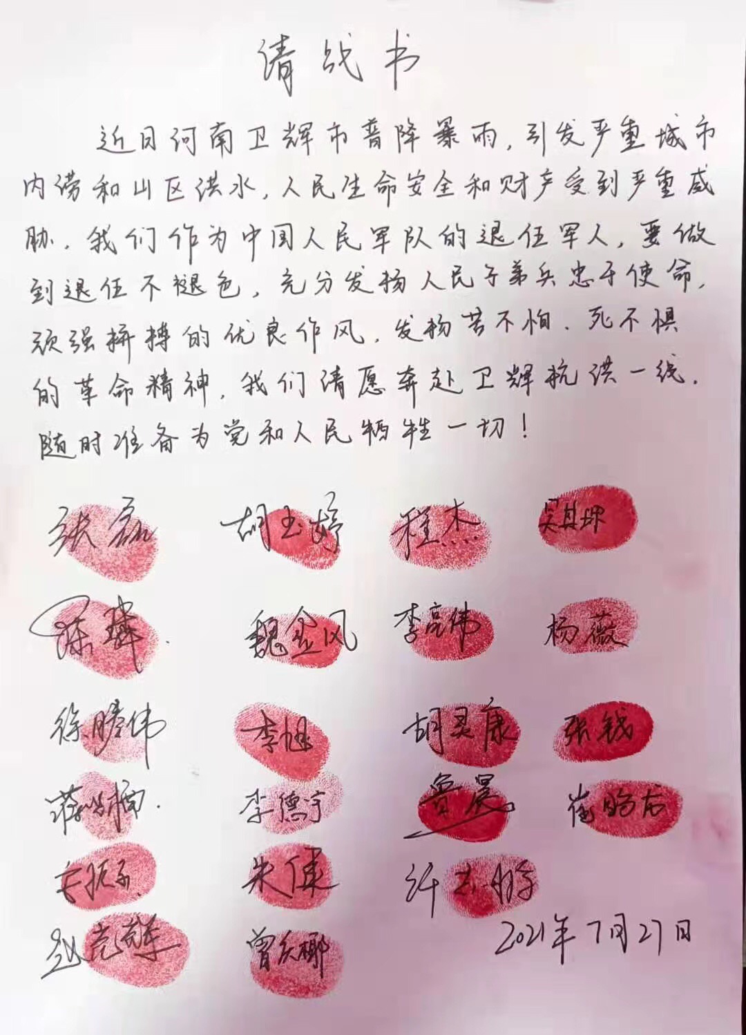 连日来,河南突降暴雨,对当地人民生命安全和财产安全造成严重威胁。作为退役军人,朱健牢记退伍不褪色的优良作风,积极报名参加虹口区上海虹鹰救援队,因具备操舟和游泳、救护等技能,在提交报名后被选拔录用为第三批援豫救援队队员。7月28日上午,朱健与其他20名退役军人(包括上海诸多高校退役大学生士兵以及豫籍退役军人)一起奔赴河南卫辉,出发前均写下了请战书。