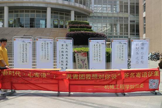 五四期间,机械工程学院在教学楼A、B楼广场举行了“新时代•心寄语”为主题的青年书画作品展和“我对共青团有话说”横幅签名寄语征集活动。本次活动分为作品征集、现场展览和网络展示环节,学院青年团员踊跃参与。通过前期征集,在活动现场展出优秀的学生书画作品,让团员们结合五四精神,共话五四情怀。同学们也纷纷以初心明志,畅谈自身感悟,抒发青春情怀。不少同学在横幅上留下“感念与共青团走过的七年岁月,我的年少有你,你的青春有我”、“青年当冒尖,年轻当活跃”、“无奋斗,不青春”等寄语,并表示要以身践行习近平总书记对青年的五大要求,在新时代的万里长空中勇担时代使命,用奋斗塑造更加壮美的青春风景。
