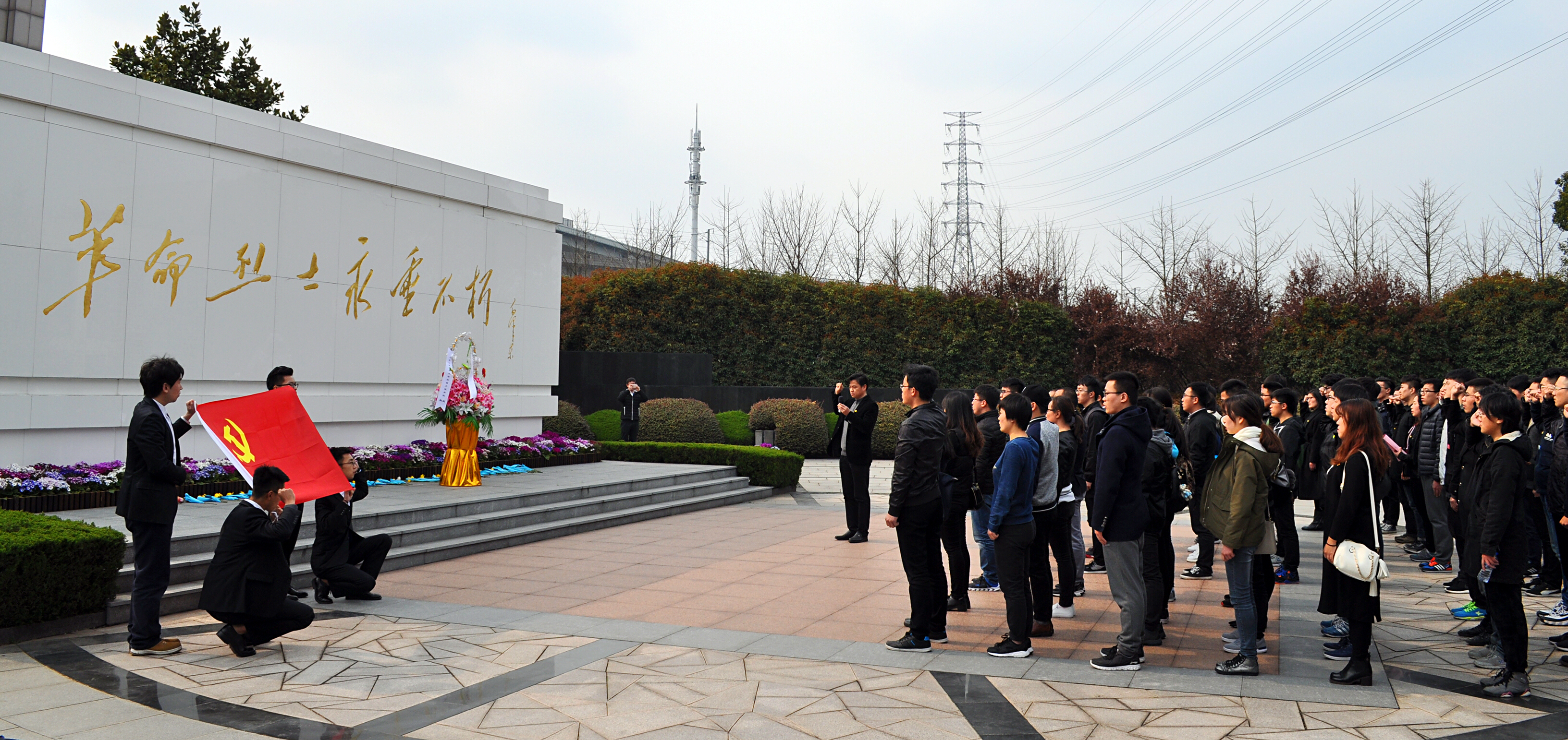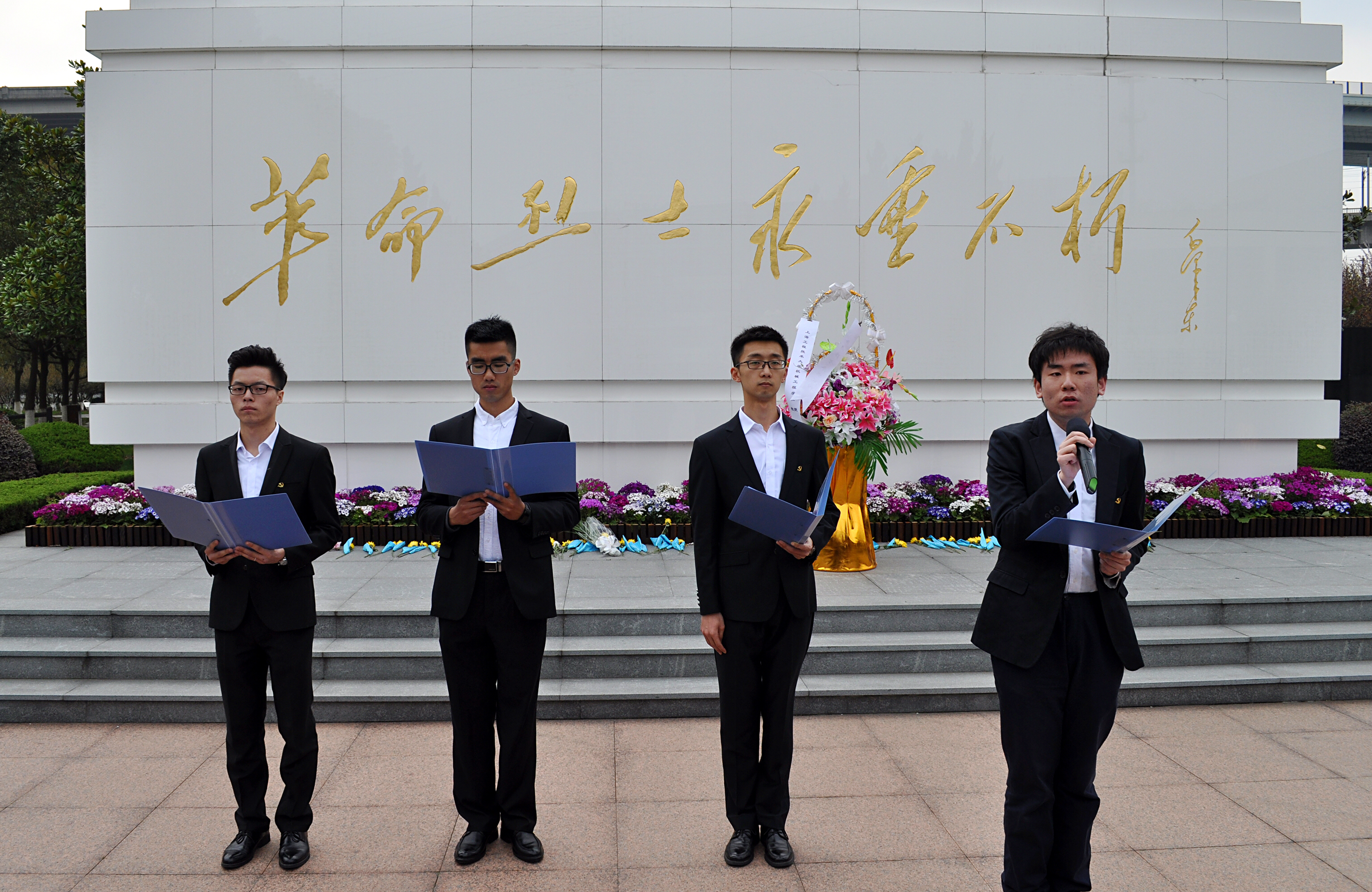 全体学生党员在学院党委副书记王东阳的领誓下,重温入党誓词:“我志愿加入中国共产党,拥护党的纲领,遵守党的章程,履行党员义务,执行党的决定,严守党的纪律……”铿锵有力,掷地有声,每一句誓辞都回荡在闵行区烈士陵园上空。