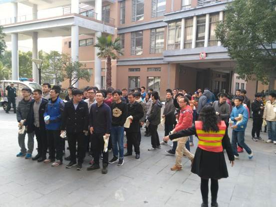 为进一步强化消防安全教育,提高师生火场应急逃生和自我防范能力,12月9日上午,学院在实训楼4号楼举行消防疏散逃生演练。本次演练目的即“珍爱生命、远离火灾”。学校保卫处相关人员现场指导同学们如何逃生疏散、应急救援等,学院实验室教师参与了演练的引导疏散指挥工作。整个演练活动组织严谨,紧张有序。参加演练的同学严肃认真,服从指挥,不抢先、不推搡、不拥挤,没有发生推、拉、拥、 挤等现象。集合完毕后各班班长迅速清点人数并向现场总指挥汇报。从下达命令演练开始到最后一名同学疏散、 到安全集中点,仅用了 2分 50秒。