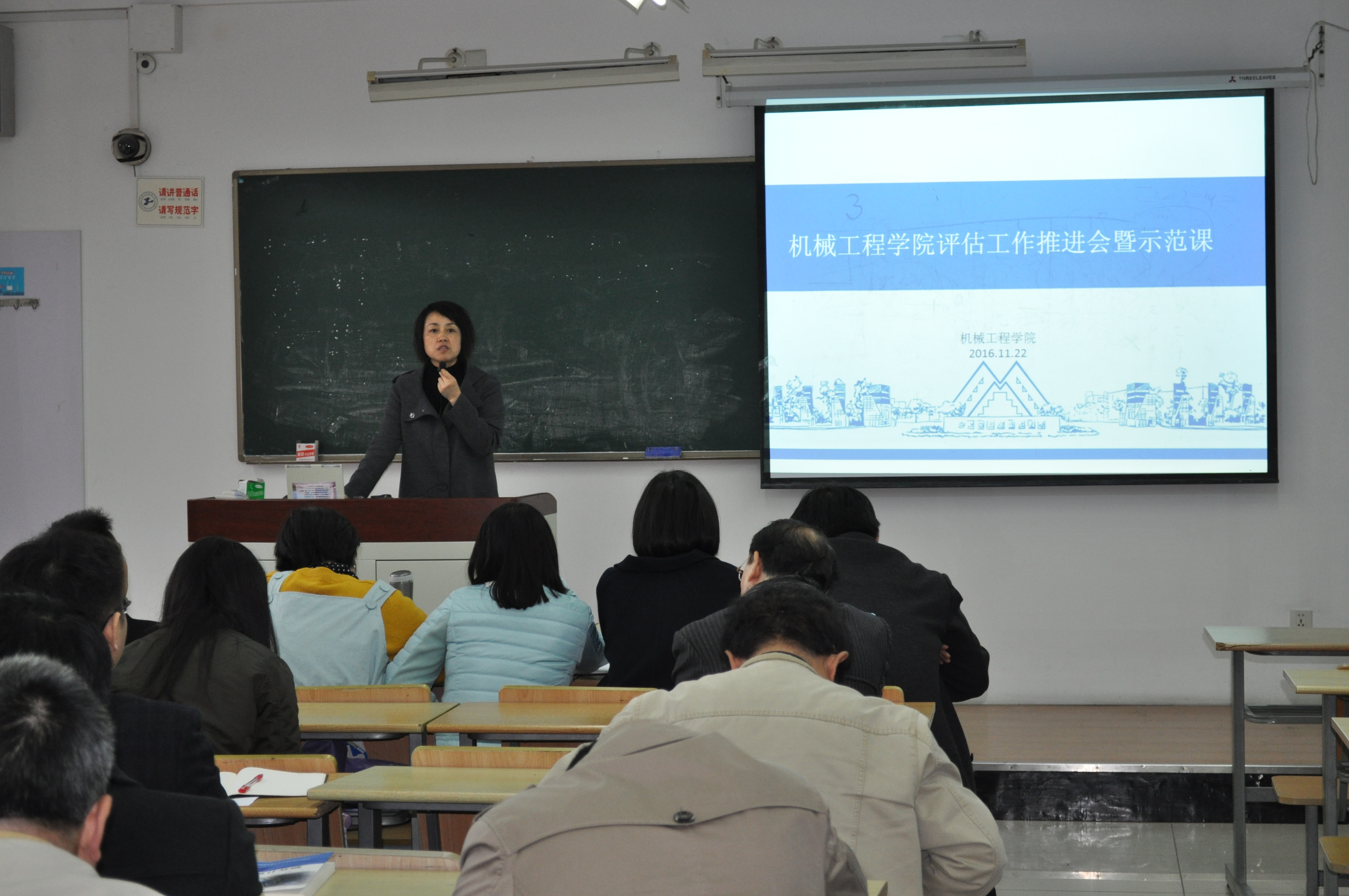 为做好学院教学审核评估工作,我院于11月22日召开迎评工作推进会,邀请骨干教师金晓怡、滕兵讲解示范课,学院班子成员和全体教师出席会议。