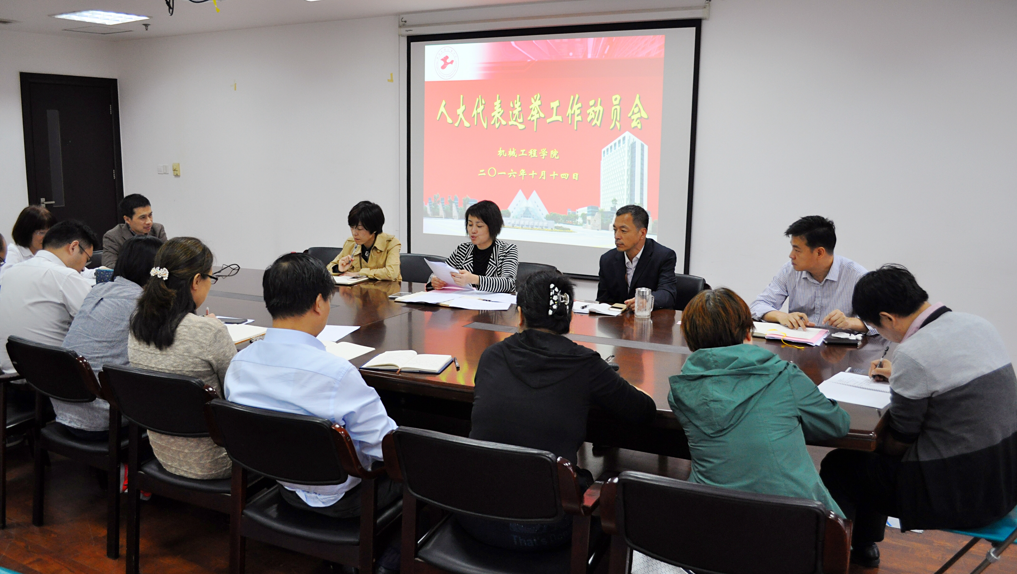 10月14日上午,机械工程学院在行政楼1208会议室召开2016年区人大代表换届选举工作动员会。学院班子成员和系室主任参加会议,会议由学院党委书记茅红柳主持。