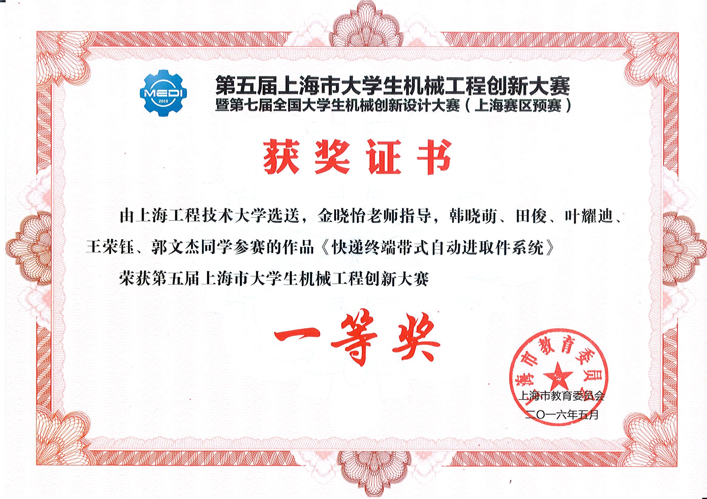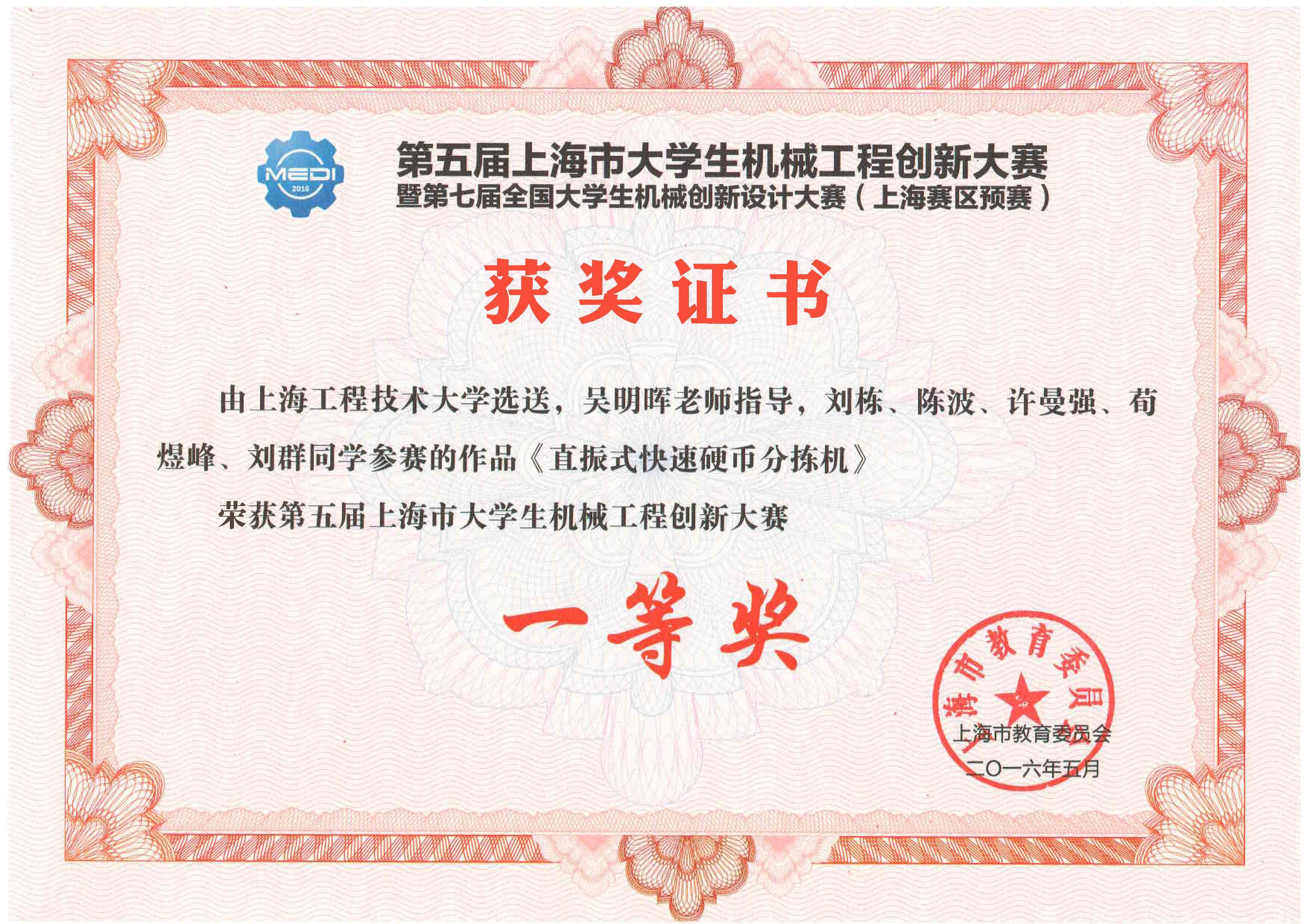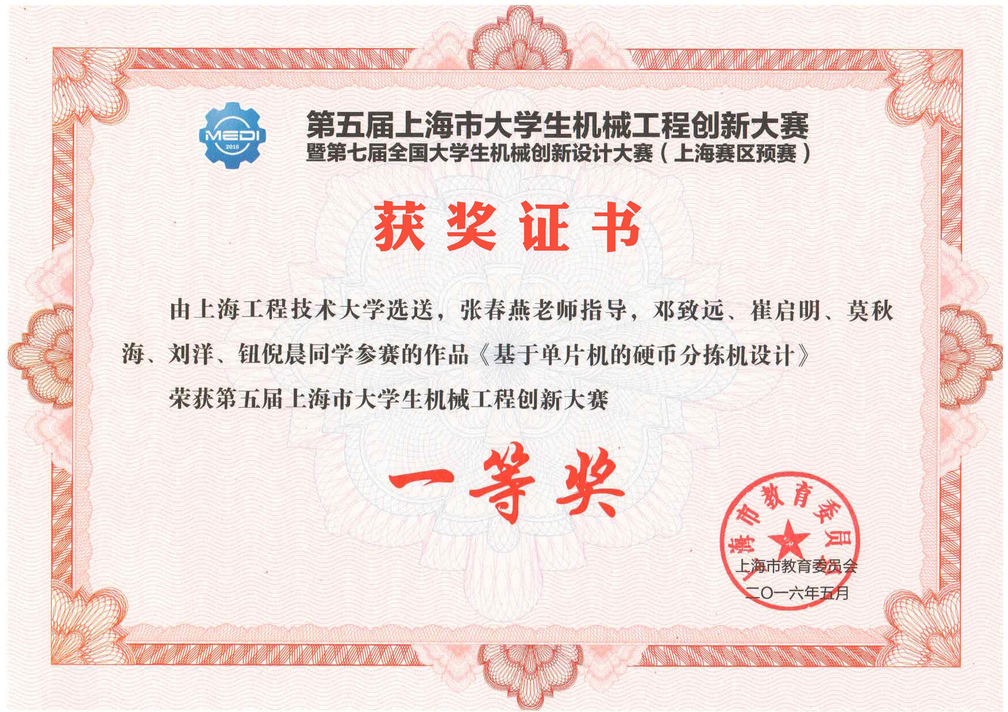 我院学生参赛作品《直振式快速硬币分拣机》、《基于单片机的硬币分拣机设计》、《快递终端带式自动进取件系统》荣获第五届上海市大学生机械工程创新大赛一等奖