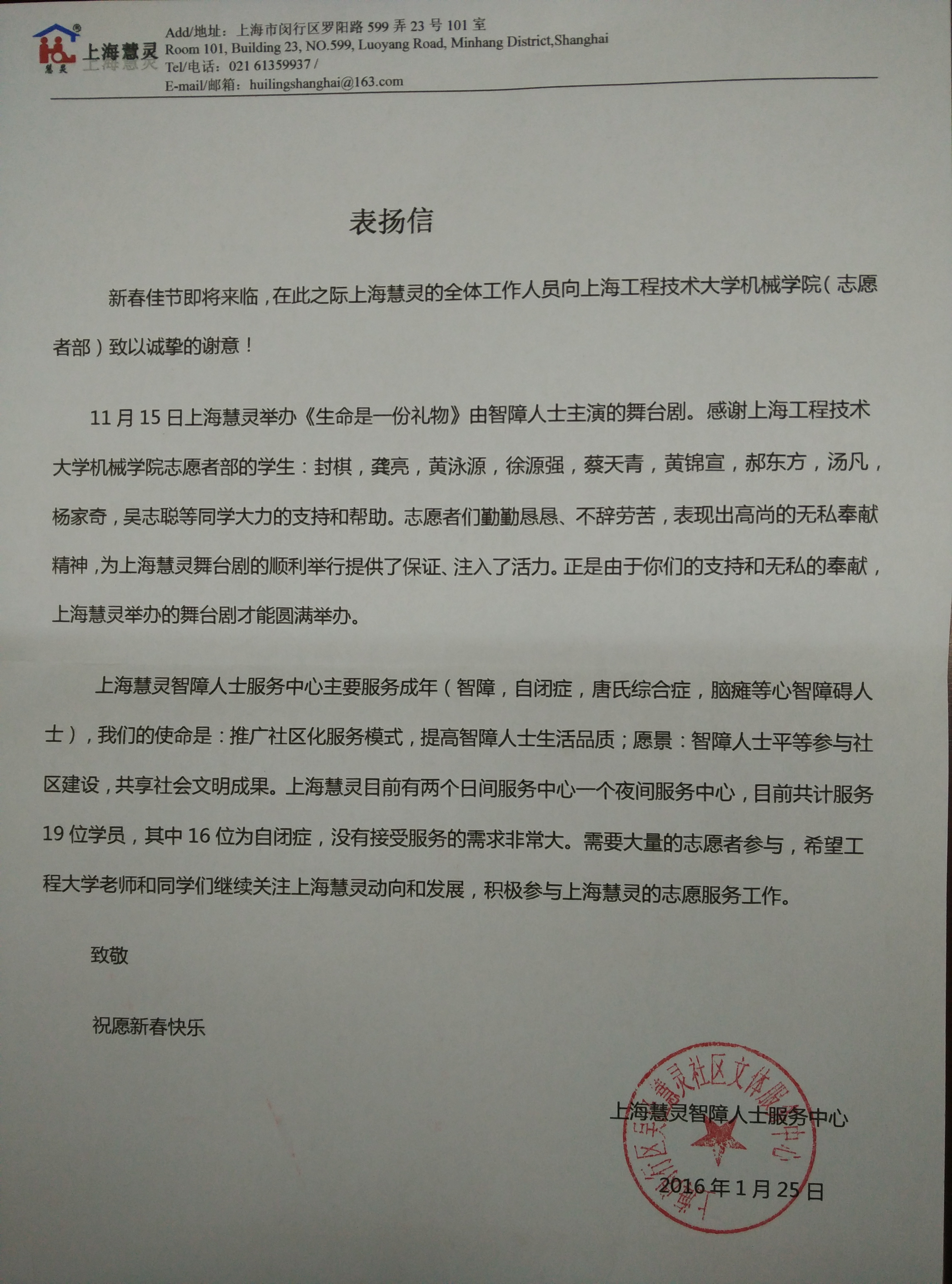 近日,机械工程学院团委收到一封来自上海慧灵智障人士服务中心写来的表扬信,感谢学院大学生志愿者对中心的智障人士送去的关爱和帮助。
