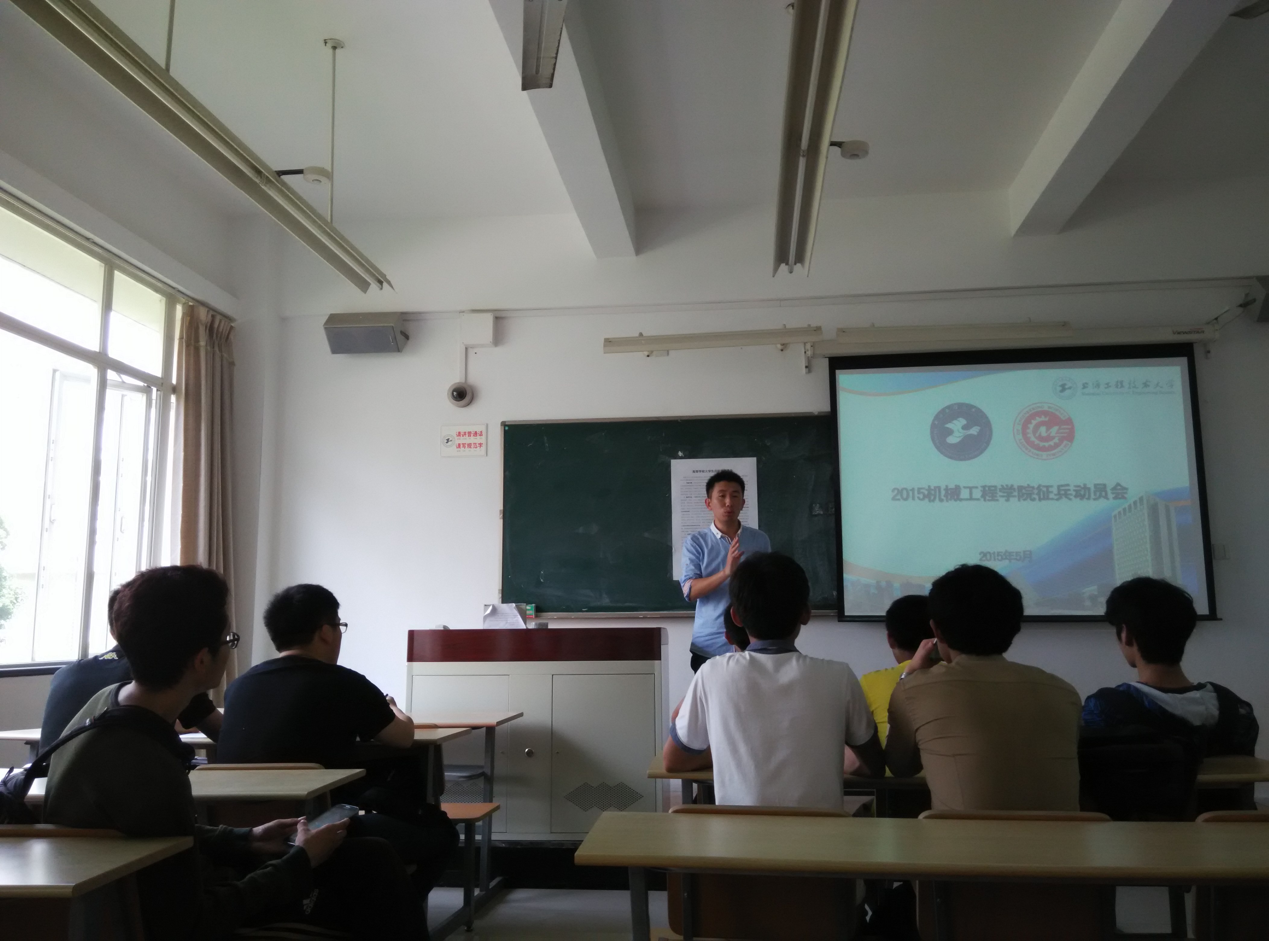 携笔从戎报国,军营放飞梦想。为鼓励大学生参军入伍、报效祖国,5月19日,机械工程学院在C114教室召开2015年征兵宣讲动员会,会议由负责征兵工作的辅导员董春亮老师主持。参加动员会的有来自各个班级的同学们。宣讲动员会上董老师详细地介绍了2015年大学生征兵工作的时间和要求,征兵的程序和方法,应征入伍大学生享受的优待政策等。现场同学们也积极提出一些疑问,董老师详细一一作了解答,同时鼓励大家把握住机会,踊跃报名参军入伍,一方面献身国防事业,为保卫祖国建功立业,另一方面也让自己的人生有一段丰富宝贵的人生经历,有一个难得的提升能力的成长平台。