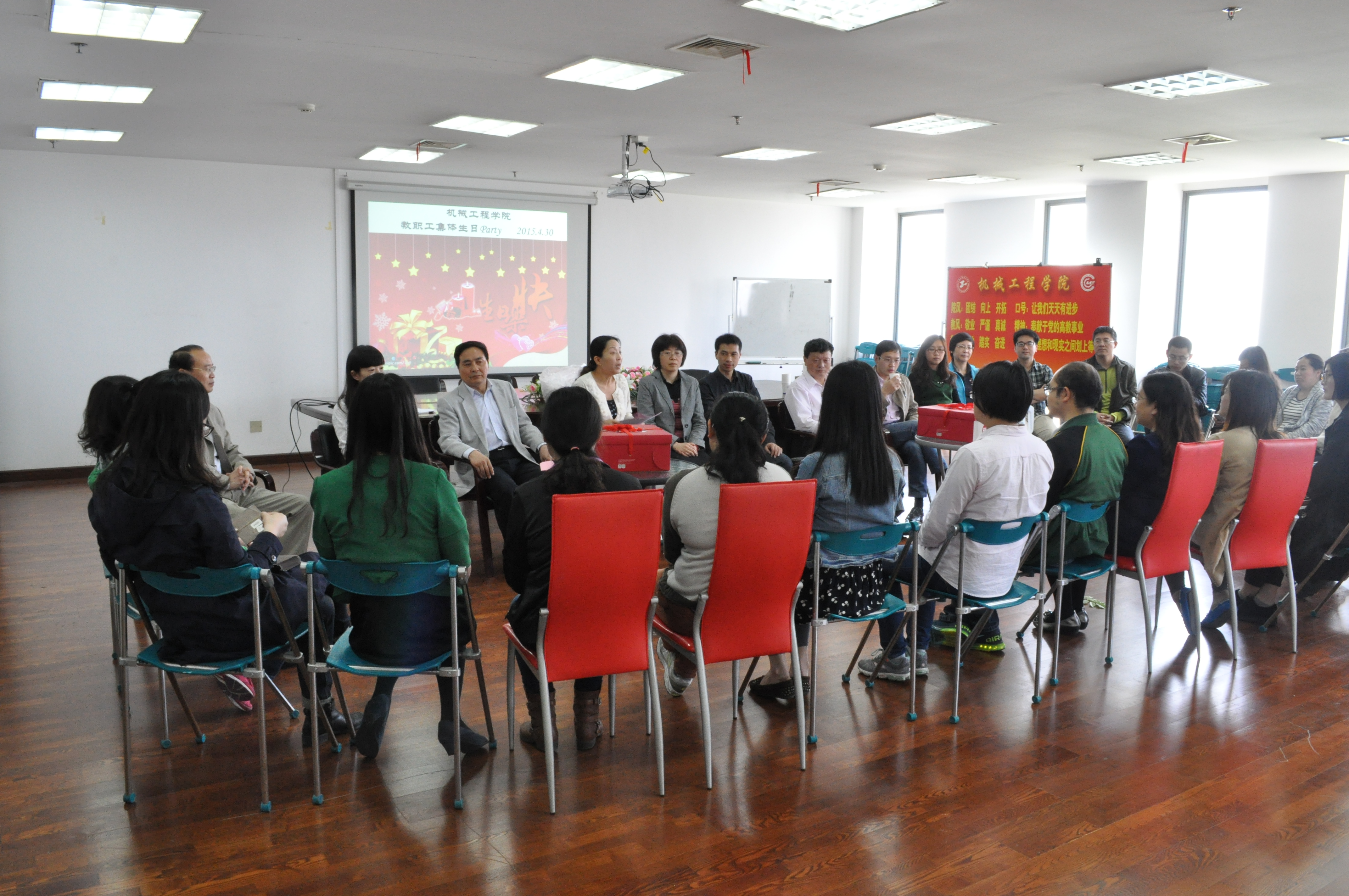 2015年4月30日下午,机械工程学院教职工济济一堂为上半年过生日的教职工举行了“集体生日会”。程武山院长和虞蓉书记出席并为老师们送上了校工会发的生日蛋糕卡。学院工会也为寿星们准备了生日蛋糕,在音乐声中集体生日仪式推向高潮,此次集体生日会形式生动活泼,内容丰富多彩,给大家带来了阵阵笑声。