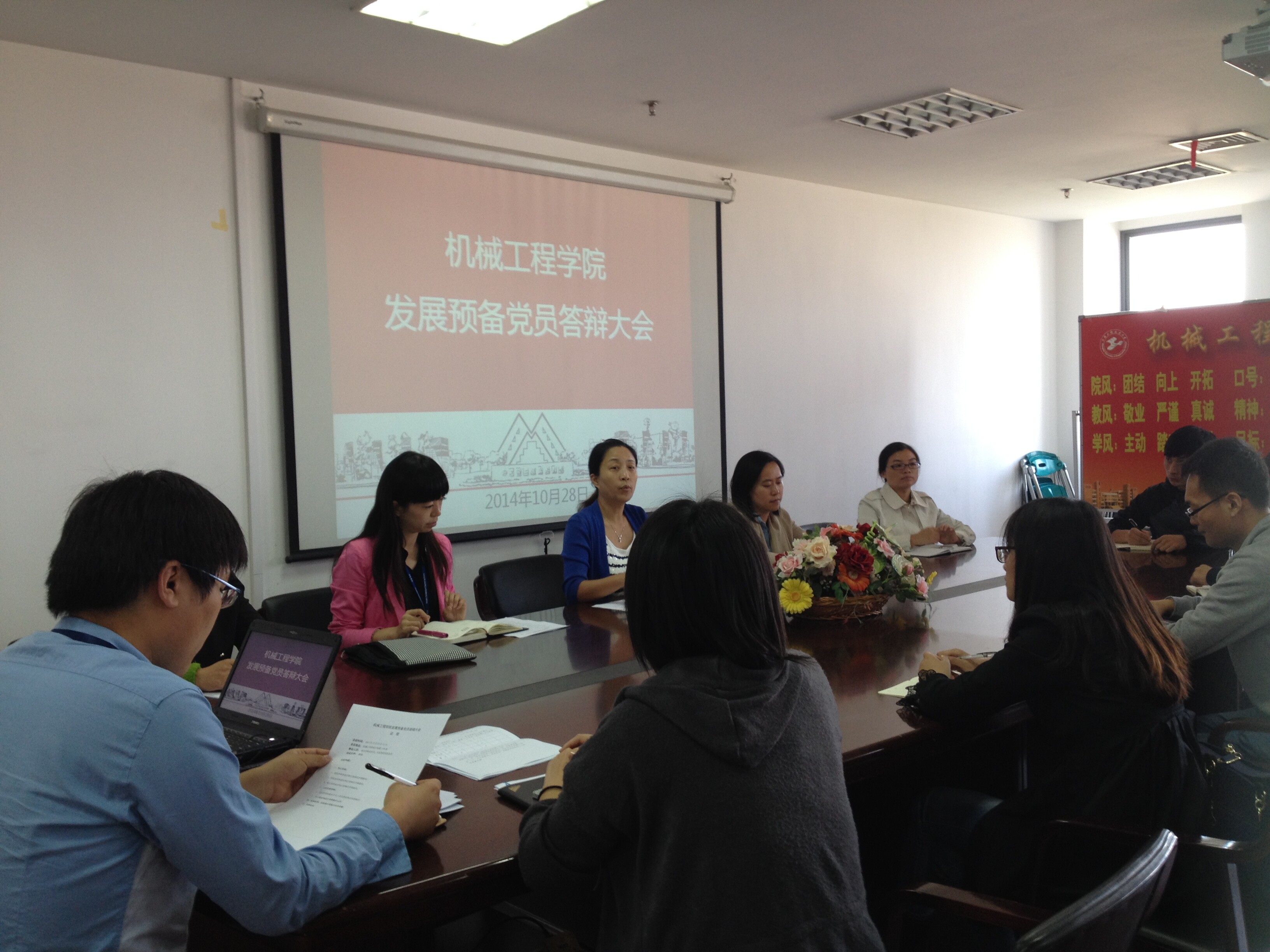 10月28日12点15分,机械工程学院党委在行政楼1208室召开2014年机械工程学院发展预备党员答辩大会,学院党委书记虞蓉,院党委副书记梅元媛,院党支部书记钱莉、曹雅致、汪文婷、王雁出席本次会议。会议由机械工程学院党委书记虞蓉主持。