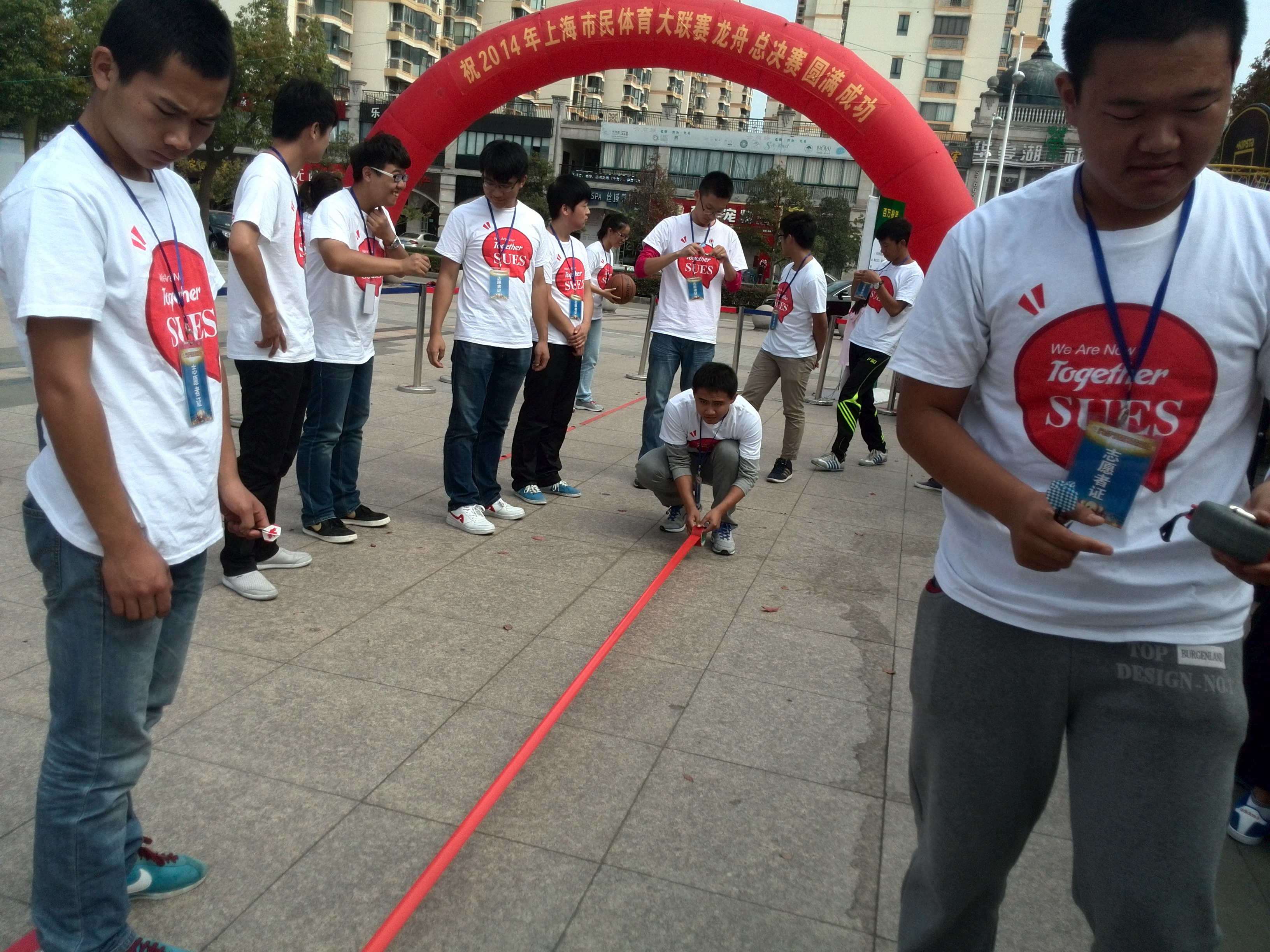 上午11时,志愿者们就已经集合完毕并发放好工程大专属的志愿者服装与挂牌,整装待发。11点45分,到达华亭湖畔的滨湖广场,并在老师的带领下进行准备工作:摆放器材、设置围栏、发放用具。志愿者们被分为陆上活动报道组、篮球裁判组、飞镖裁判组三个组,分别负责出入口报名、篮球活动和飞镖活动。