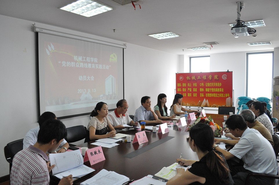 9月13日上午,机械工程学院分党委在学院会议室召开深入开展党的群众路线教育实践活动动员大会。校内督导组组长余强明老师、学院党政领导、正副系主任、全体党员教师及学生党员代表出席了大会。学院分党委书记虞蓉、院长程武山作动员报告,校内督导组组长余强明作督导工作讲话,会议由虞蓉书记主持。