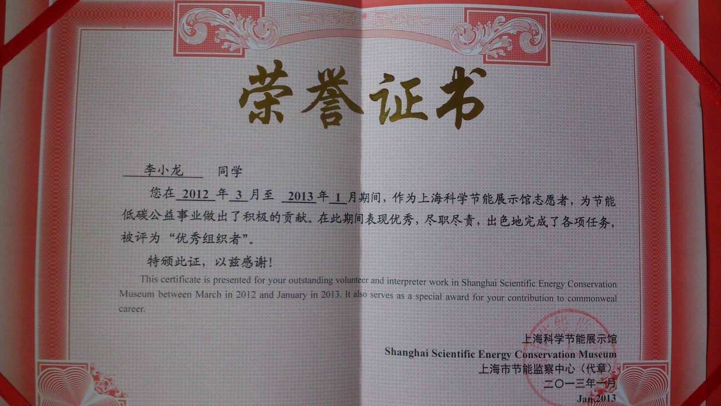 此外,学院李小龙同学被评为2012年度上海市节能馆志愿者优秀组织者,展现了当代大学生乐于奉献自我,服务社会,服务人民的志愿者精神,也表现出了学生志愿者无私贡献、传递爱心、传播文明、力争为市民创建更好的社会氛围的优良风貌。