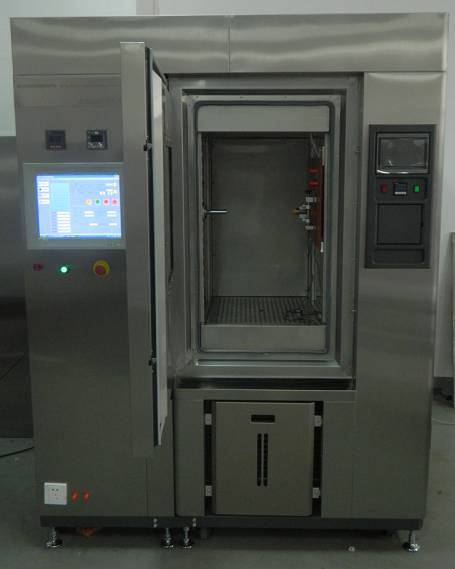 试品安装机构以及移近标靶设计在腔体内,而传动机构和测控装置均设计在箱体内,试品安装需考虑通用性夹具,而标靶更换亦需考虑便捷性要求,全程自动化控制标靶沿导轨轴向移近,速度需可调,可靠稳定且能保持匀速,最快移近速度需达到20mm/s,接近开关动作距离范围时可将速度降至最低要求<1mm/s,移动装置运动平直度±0.1mm。高低温箱温度在-30℃~+80℃范围内连续可调,风速可调,箱内温度波动度±0.5℃。