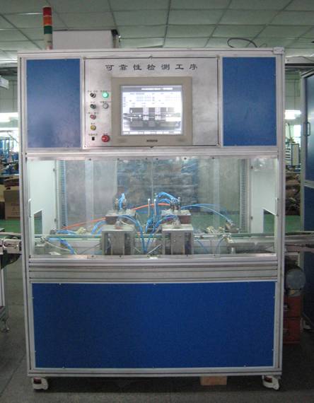 该测试台用于测量断路器的可靠性。采用自动装夹,对单个断路器多次重复储能、合扣检测。测试不合格的产品自动放入不合格品料道;测试合格的产品自动放入合格品料道。执行系统由气缸、电机带动,光电、电磁传感器信息反馈,PLC、工控机控制,具有测试件信息自动识别、自动设定测试参数、自动选择测试程序、自动测试并对测试结果进行自动登记、分选等功能。