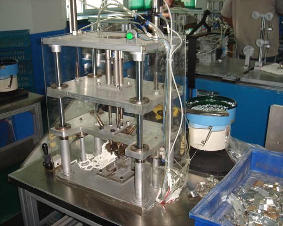 组合送料式3轴螺钉拧紧机将触刀、白色垫片和熔断体陶瓷外壳固定在一起。该设备创新点在于:开发振动、输送、选排螺钉技术,将螺钉按规律进行排列输送,实现螺钉分拣、选排、输送自动化;开发直线振动、气动模块带料技术,实现螺钉的成组分配,为输送提供基础;开发气流成组输送技术,将一组螺钉输送到气动拧紧机,柔性分开式螺钉定位器中,为螺钉枪提供螺钉和位置;开发柔性分开式螺钉定位器,保证螺钉准确定位;采用了四柱双板移动式结构,使3个气动螺钉拧紧机构同步可靠运行;采用了柔性补偿技术,使3个螺钉扭矩均匀,工作可靠。