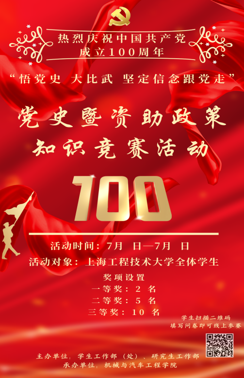 本次活动面向全体在校学生,围绕党史知识和资助政策展开,测试题目分单选、多选和判断题三种题型,采取线上竞答的方式。活动中,同学们踊跃报名,参与积极性高。在激烈的比拼下,最终从360参赛同学中评出一等奖两名、二等奖五名、三等奖十名。其中,管理学院的彭亮同学以满分100分,用时247秒的佳绩获得第一名。