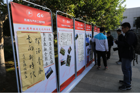此次为表达建校四十周年的喜悦,来自我院刀笔书画社的同学专门现场作画,以学校里面标志性的建筑、美丽的风景作为此次活动的画稿,例如图书馆,体育馆等,以表达对学校的感谢与热爱。活动前同学们精心准备,每一笔色彩,每一刀工艺都是每个工程技术大学学子对学校的感恩与祝福。