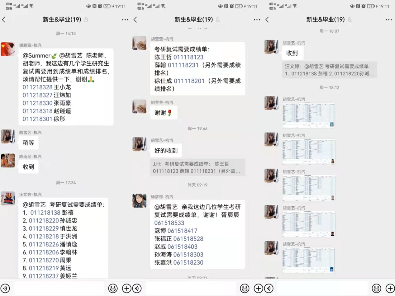 学院教务员陈雨涵老师、胡雪艺老师扎实落实“停课不停学”的文件精神,积极配合教务处做好疫情期间网络教学的宣传工作,及时向我院师生传达学校关于做好疫情期间教学工作的相关文件及工作方案,协助教师使用和熟悉网络教学平台,及时梳理每天课程信息整理成课表,确保“每门课程有平台,每名学生有课堂”,针对师生遇到的各类问题及时进行反馈并给予帮助解决。当前正处于考研复试的关键阶段,不少学生面临着难以打印成绩单、成绩证明等困境。由于本轮值班,党政办公室只安排了1名老师轮值,学院教务员未能正常进校,难以开展现场打印成绩单服务。针对此情况,学院教务员积极对接各辅导员,提供相关学生的成绩单电子版。迄今为止已为近100名学生提供了电子版成绩单,解决了学生的实际困难。此外,陈雨涵老师和胡雪艺老师每天在QQ上在线解答学生关于选课、在线课程等相关问题,进一步满足了学生的个性化需求。