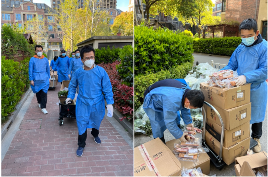 沈骏同志担任嘉定区安亭镇六泉桥居委会苏河源社区的抗疫物资输运志愿者工作,负责配送小区内62号和63号27层高层楼共108户家庭的物资分发,物资包括莴笋、西蓝花、包菜、咸肉、牛奶。物资由志愿者统一配送上门,发放过程秩序井然,本次物资配送有效缓解了封控期间居民蔬菜紧缺的困难。傅允准同志担任所居住区域万源城四期的志愿者工作,负责所在楼栋共32户家庭的物资和蔬菜分发。