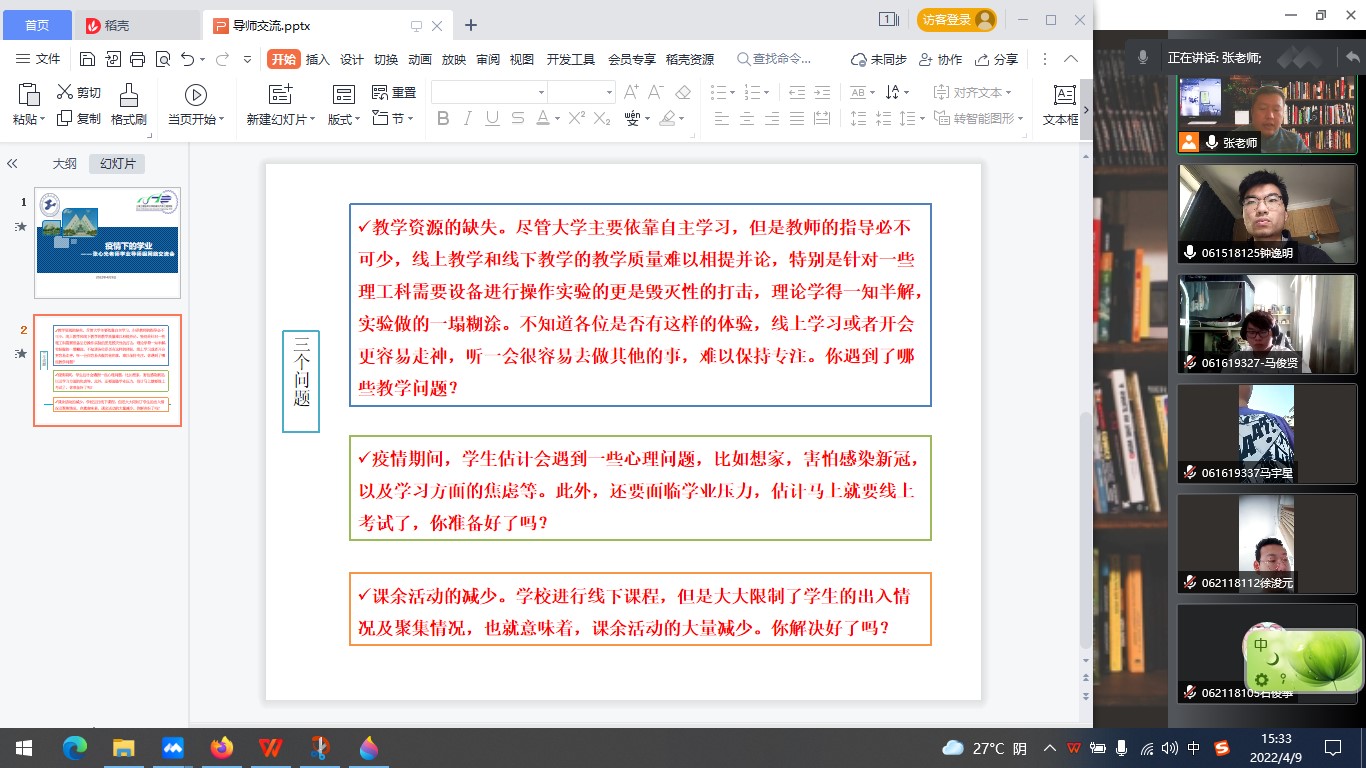 交流中,学业导师老师分别对学生提出三个问题,即“线上教学,已经开展4周了,大家是否已经适应;检验大家学习成果的时刻马上就要到来,从现在看来第9周线上考基本成定局,你是否准备好了呢?线上教学,有的在家封闭,有的在校封闭,心态保持如何?不管疫情如何,困难总归过去,学业还要进行,你的大学生涯没有停止,目标有没有改变?线上教学,不论在哪个空间,与父母相处,与室友相处都是最近距离的相处,如何互相体谅,互相帮助,共度难关,你解决好了吗?”