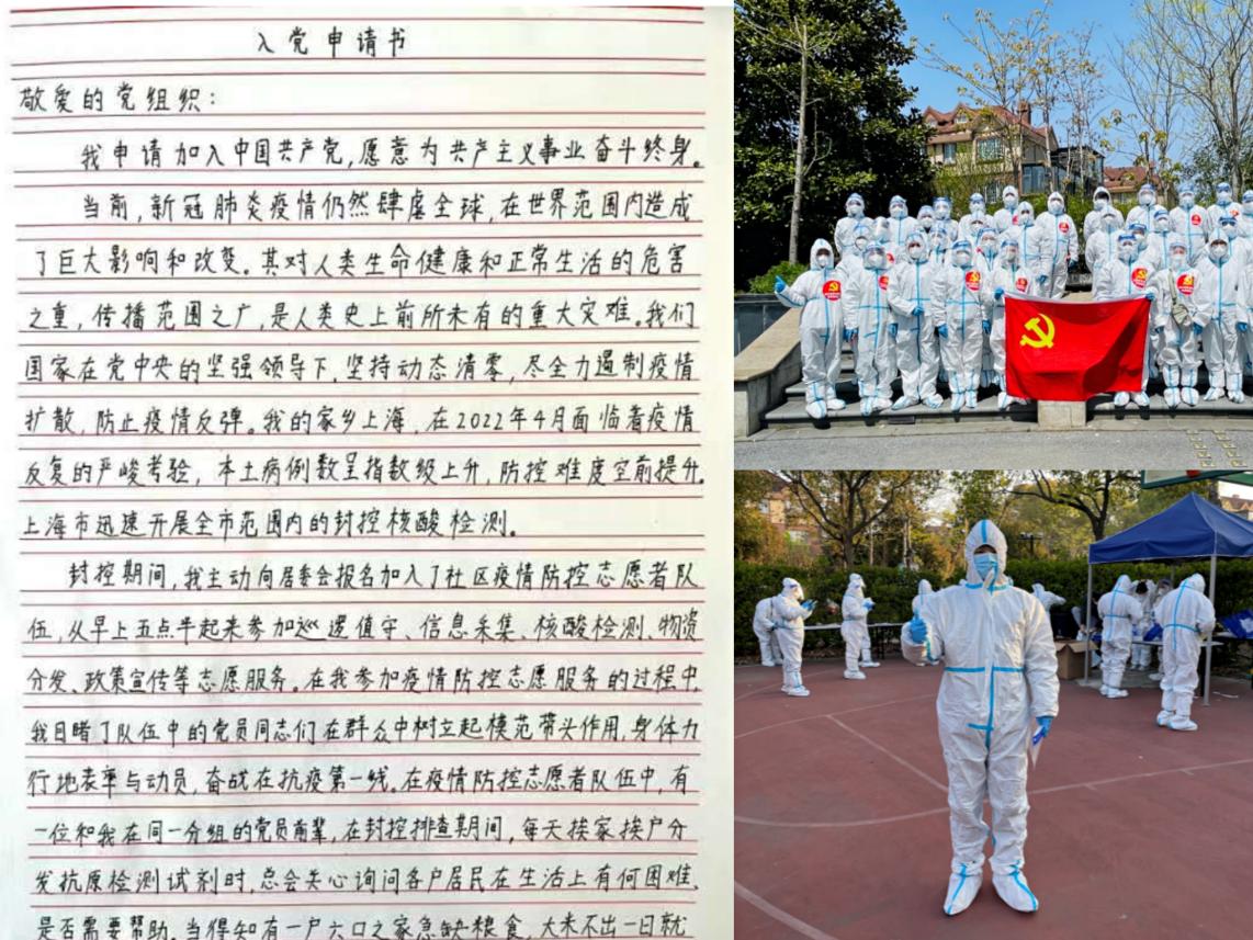 看到党员们不畏艰难、奋不顾身地奔赴疫情防控前线,封哲宇心中产生了加入党组织的强烈愿望。封哲宇看到身边的党员一言一行体现出来的敢为人先、舍己为人的品质;看到身边的党员舍小家为大家,用团结统一的思想、无惧无畏的精神、雷厉风行的行动,加入疫情防控队伍;看到身边的党员号召并动员居民群众,默默付出、无私奉献。这些党员们在抗疫中每一声亲切关心的嘱咐,每一个舍己为人的举动,都深深地感染着封哲宇。他表示,我们的国家在全世界的“躺平”之风大行其道之时,不分老弱病残没有放弃每一个人,坚持动员巨大的人力物力,进行动态清零,尽最大的能力保护好这片土地上的每个人,这其中下定决策之果断、抗疫过程之艰苦,无不体现着“为人民服务”之恒心,这些激起了封哲宇向党组织靠拢的拳拳之心。