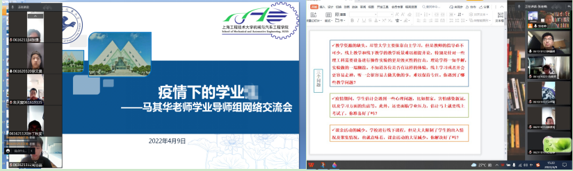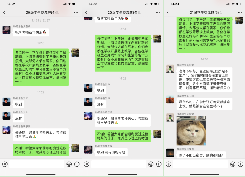 学院张爱华老师结合自己志愿者期间的所见所感,传递社会正能量,引导学生积极配合响应学校疫情政策,树立抗疫必胜的信心。机械创新设计教学团队、力学教学团队等及时展开团队研讨,由于各年级学生被关在寝室开展网课已经一月有余,不定期进行核算和抗原检测,为摸排了解学生在校期间的学习和生活情况,团队每位教师以不同的方式(电话、微信、QQ、腾讯会议等)与自己带教学生进行交流,了解学生的学习及生活动态。引领学生齐心协力、共克时艰!