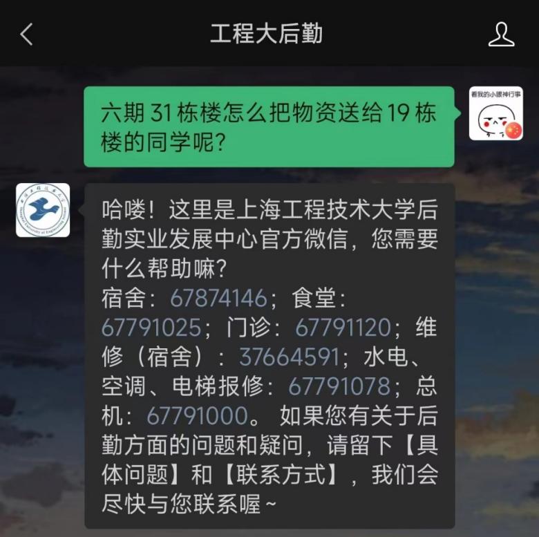 住在31栋的来自数字化精密加工仿真实验室的程耀天曾在组会交流时听到同门提过缺少生活物资,便时刻惦记着是否能找到机会提供帮助。4月23日,程耀天辗转找到了学校后勤的公众号“工程大后勤”,抱着试一试的想法,他在后台留言询问是否能够从六期31栋运送一些物资给19栋楼的同学。令他意外的是,很快他便接到了后勤负责人裘立行老师打来的电话。裘立行老师细心询问了相关信息,并主动提出帮忙联系六期的管理人员进行协调。同时,程耀天与同在一个实验室的林旭东和谢朝雨一同着手准备给同门的物资。受到他们热心行为的感染,他们的室友戴雨轩、贾东昇、李汉林也纷纷慷慨相助,拿出了自己的水果、面包等物资,希望能够帮助到那位“远在”19栋的同学。