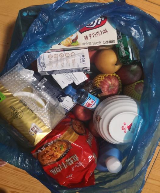 当天晚上7点,裘立行老师告知程耀天,通过协调他们找到了一位热心的宿管阿姨帮忙运送的物资。晚上8点,这位热心阿姨(同学们亲切地称呼她为“大阿姐”)从程耀天的手中接过了这份沉沉的物资,做好消杀工作,独自将这份爱心物资从31栋背至19栋,交到了19栋受助同学的手里。受助同学将物资中的两个苹果拿给“大阿姐”以示谢意,“大阿姐”笑着拒绝道:“你拿着就行了,你们比较缺东西,阿姨这边不缺的”。事后向裘立行老师表示感谢时,他也表示后勤人员就是时刻为全体师生服务的,为六期学生转运物资、提供生活帮助是他们的职责所在。