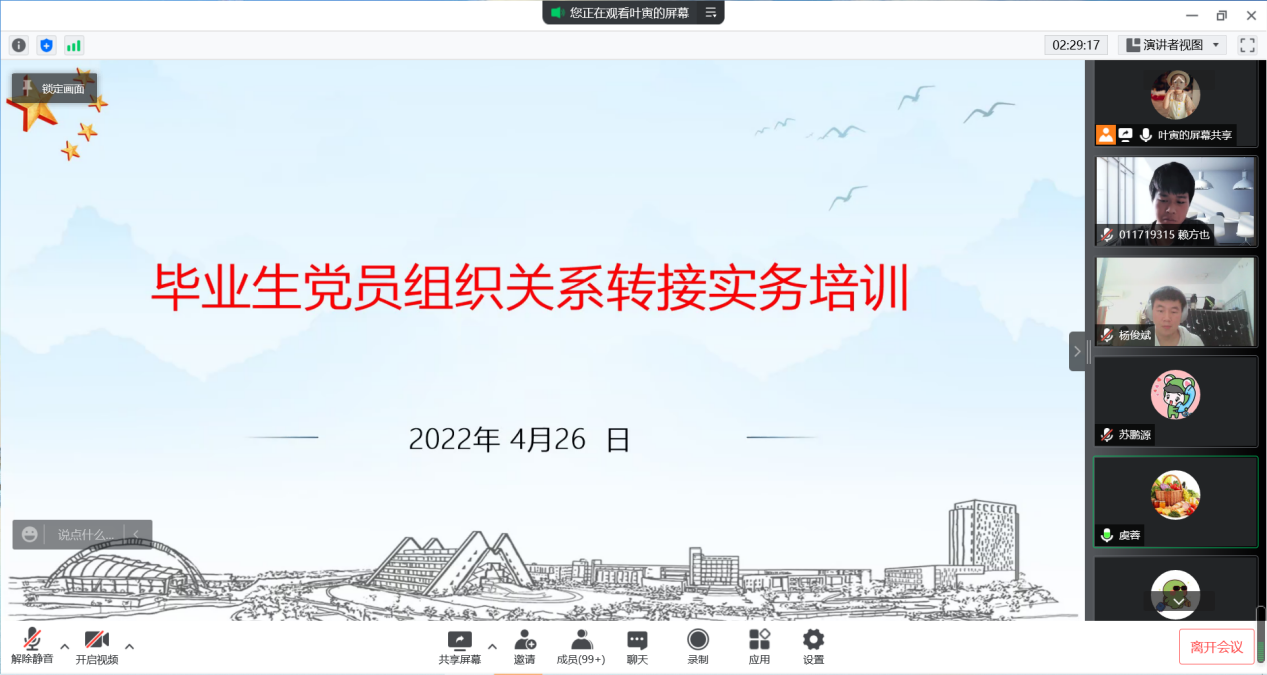 为强化毕业生党员身份意识,切实抓好毕业生党员离校教育和管理工作,引导广大毕业生党员坚定信念、脚踏实地、担当作为。4月26日中午,PP电子游戏网站党委线上举行“弘扬抗疫精神坚定信心,践行使命担当不负韶华”毕业研究生党员离校教育活动。学院党委书记虞蓉、松江老兵宣讲团谢鲁淮、学院组织员、研究生党支部书记和全体2022届毕业研究生党员、本科生党员代表近270人参加会议。本次毕业研究生党员离校教育活动由学院党委书记虞蓉主持。