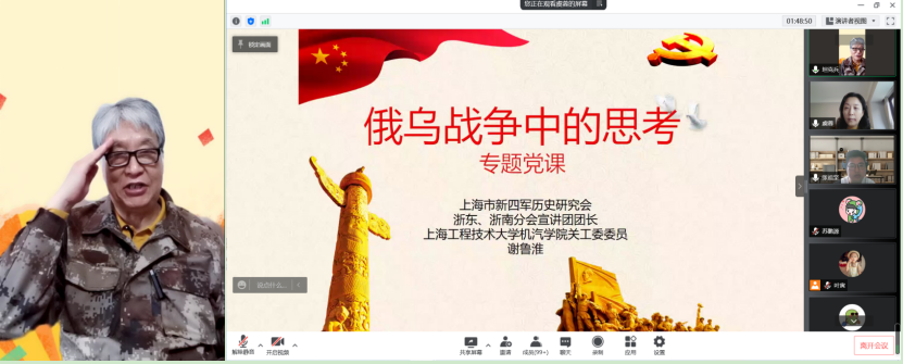 虞书记对谢鲁淮老师应邀参加此次云端报告深表感谢。谢鲁淮是松江老兵宣讲团的主力成员,拥有非常丰富的理论和军事报告经验,他的讲课内容生动,意义深远,深受欢迎。本次报告会前充分准备,结合时事,主题突出,引人入胜,把思政教育融入到学院三全育人过程中。虞书记强调,广大与会党员要认真领会谢老师报告的深刻内涵,关心时事政治,分析思考战争背后的真实原因,坚持当好“历史的见证者”。作为研究生党员,即将踏上工作岗位,要坚持围绕“打铁还需自身硬”的目标要求,不断提升自身综合素养,时刻牢记党员形象,争创国家先进制造业所要的创新型人才。