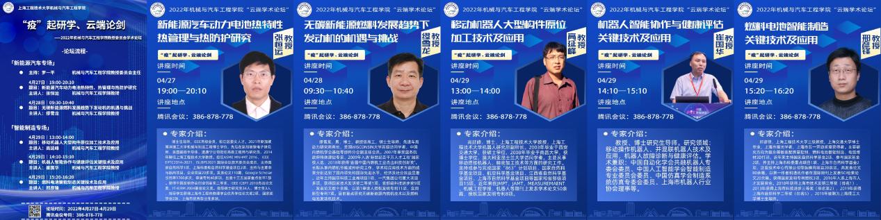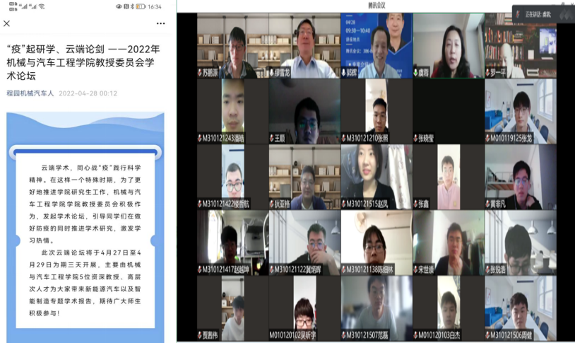 此次云端论坛于4月27日至4月29日为期三天开展,主要由PP电子游戏网站缪雪龙、崔国华等5位资深教授、高层次人才为大家带来新能源汽车、智能制造专题学术报告。每场报告均吸引了学院师生的广泛参与,师生们纷纷感谢学院的精心组织,特殊时间的学术盛宴让大家倍感温暖,更有信心期待疫散花开。