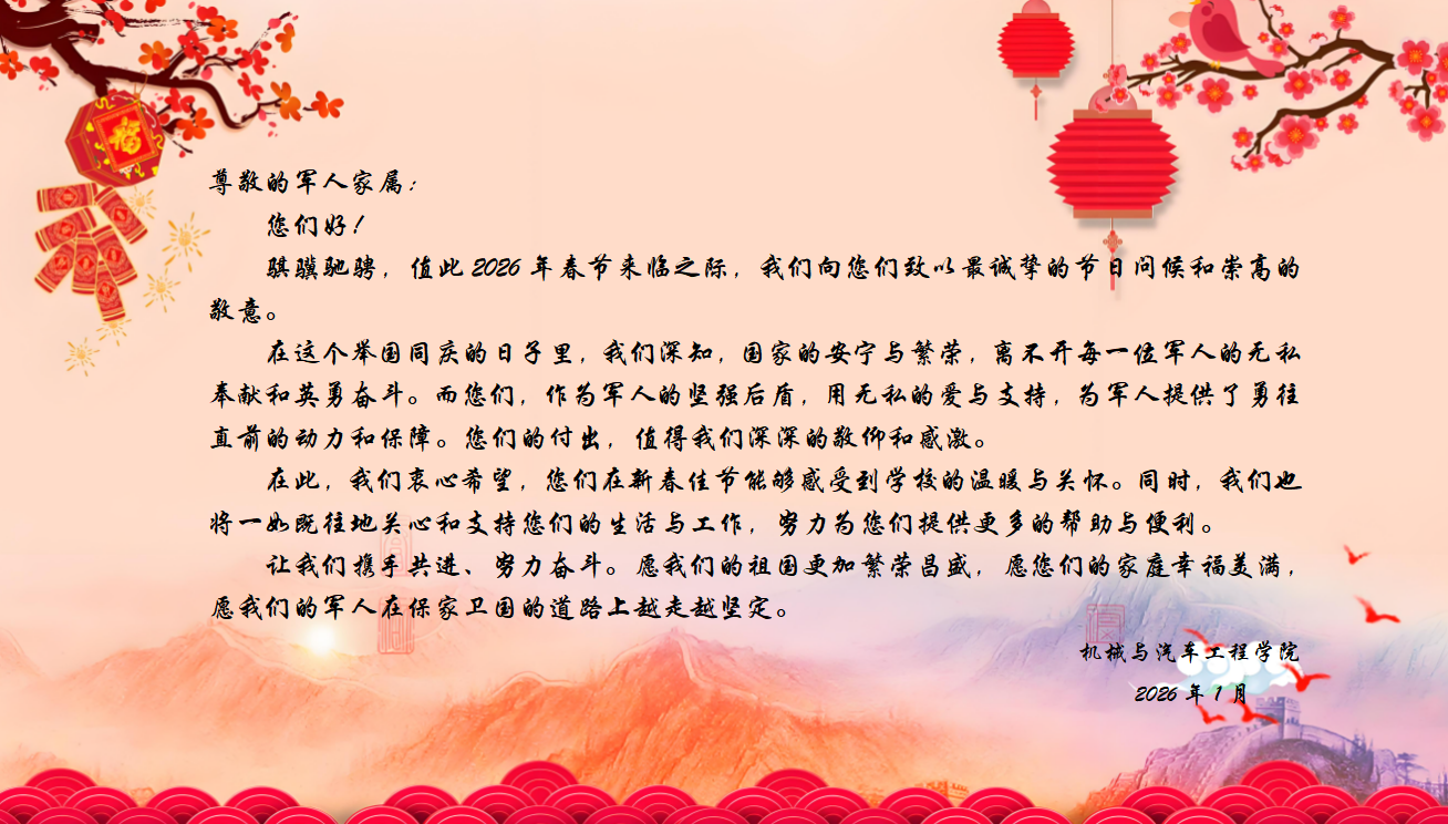 一字一句总关情,一书一信连山海。学院以电话、短信的形式与30余名现役学生密切联系,关心了解他们在部队训练、技能学习、岗位建功等方面的动态寄语他们在战备执勤、竞技比武中当标杆、打头阵、作表率,把个人成长融入强军实践。同时,与现役学生家属拉家常、问冷暖、听诉求,详细了解他们的工作生活情况并寄送新春礼包和节日贺卡,对军属们坚定支持儿女投身国防事业致以崇高敬意和衷心感谢,并表示学院将一如既往当好坚强后盾,让现役学生安心服役、军属家庭温暖过年。