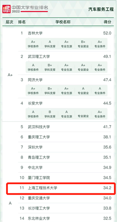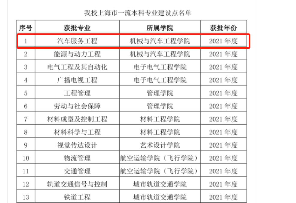值得一提的是,近期教育部办公厅印发《关于公布2021年度国家级和省级一流本科专业建设点名单的通知》(教高厅函〔2022〕14号)中,汽车服务工程专业顺利入选上海市一流本科专业建设点。软科专业排名与省级一流本科专业的入选,表明我校汽车服务工程专业的建设已初显成效。
