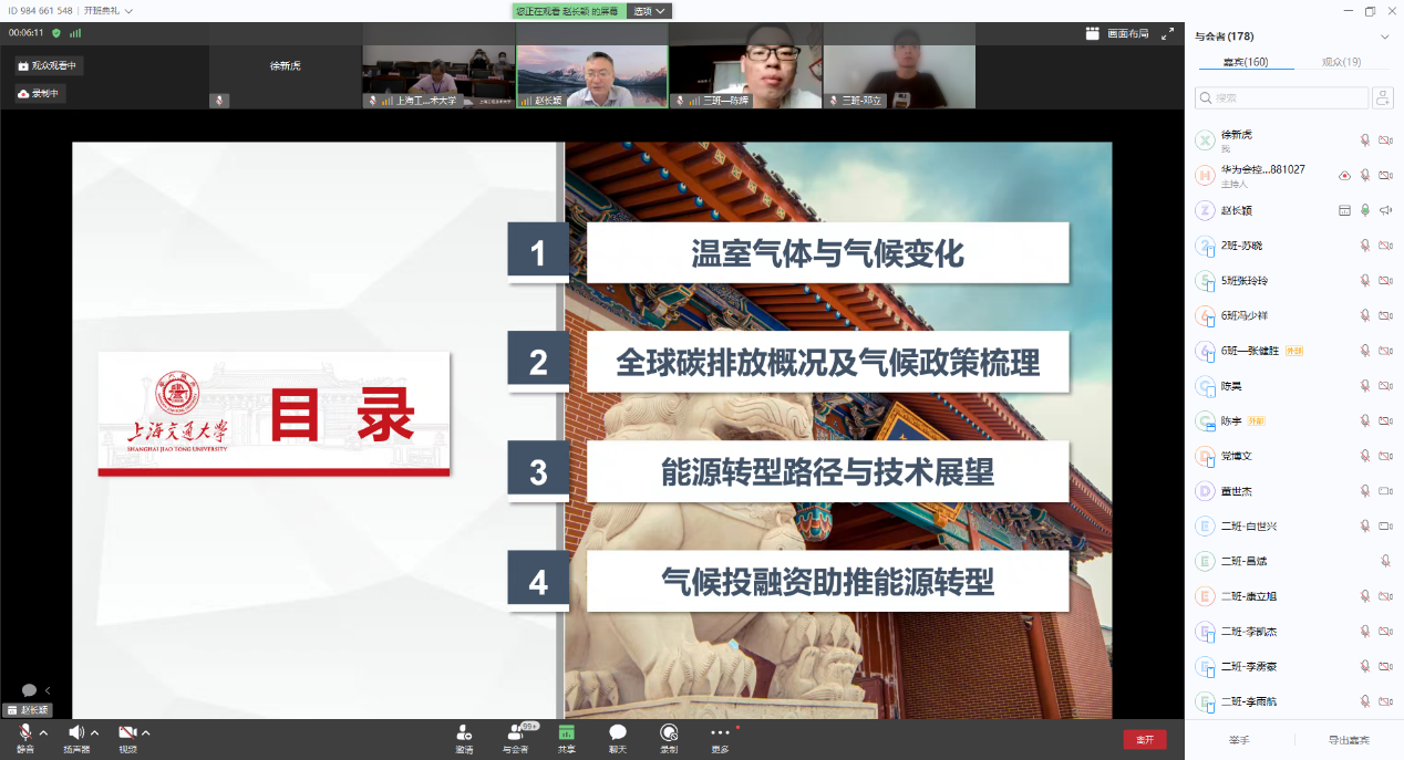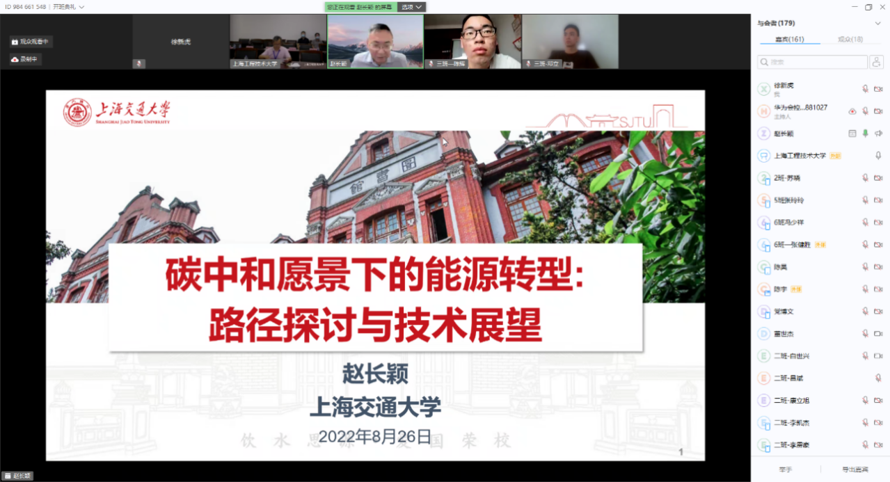 2022年8月22日上午,通过华为云会议视频平台,上海交通大学讲席教授、中英国际低碳学院院长、工程热物理研究所所长、国家特聘专家赵长颖为暑期学校做题为《双碳目标下的能源转型:路径探讨及技术展望》的线上专题讲座。讲座由PP电子游戏网站副院长严祯荣主持。