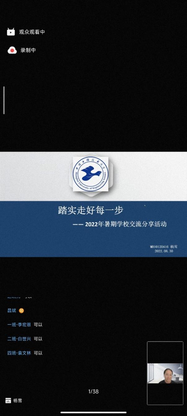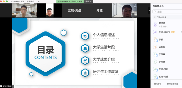 2022年8月31日,各个班的班长组织各班学员进行在线沙龙活动,主要的交流形式是学员进行PPT汇报,将自己感兴趣的研究方向或自己在暑期学校学到的知识相互分享。通过线上沙龙活动,增进了学员之间的相互了解,同时也有助于学员对专家讲座内容的有效吸收。