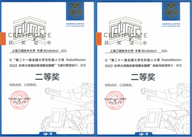 2022年的疫情给战队备赛带来了极大的困难,但是在学校各部门的大力支持和学院的鼎力相助下,木鸢Birdiebot战队全体参赛师生上下齐心,克服一切困难,在学生科创中心机械创新基地负责人张春燕老师和教务处杨光老师的远程指挥,技术指导张力骅老师的现场指导和带领下凭借堪称完美的机器人结构、精准的电控算法效果、出色的战术发挥、配合默契的团队协作打进全国赛。此外,战队在兵种完备的基础上优化各兵种的稳定性和可靠性,在单项赛中角逐,特别是“飞镖打靶”和“英雄吊射”的单项赛中更是表现完美,尤其是飞镖打靶,在一百余支参赛队伍中仅四支队伍晋级全国赛,木鸢Birdiebot战队作为第二年参加线下赛的队伍从中脱颖而出,凭借着精准的命中伤害率踏入全国赛。
