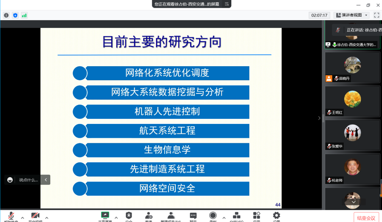 徐教授介绍了系统工程的学科背景和发展趋势,详细列举了网络与智能时代的大环境下,制造、能源、交通、航天航空等领域对系统工程的重大需求,相关的重大科学问题和关键技术问题等。徐教授具体阐述了系统工程在新时代可能产生的关键基础理论与技术,信息物理融合系统在网络化系统建模、智能性设计和规划、优化和控制以及集成安全等方面的挑战和机遇,并指出系统工程的发展趋势是自动化、信息化、网络化、智能化的相互融合。徐教授结合团队及其个人科研经历,强调科研人员要熟悉与研究内容相关领域的基础知识以及运用多学科知识和科学方法解决复杂问题的重要性。