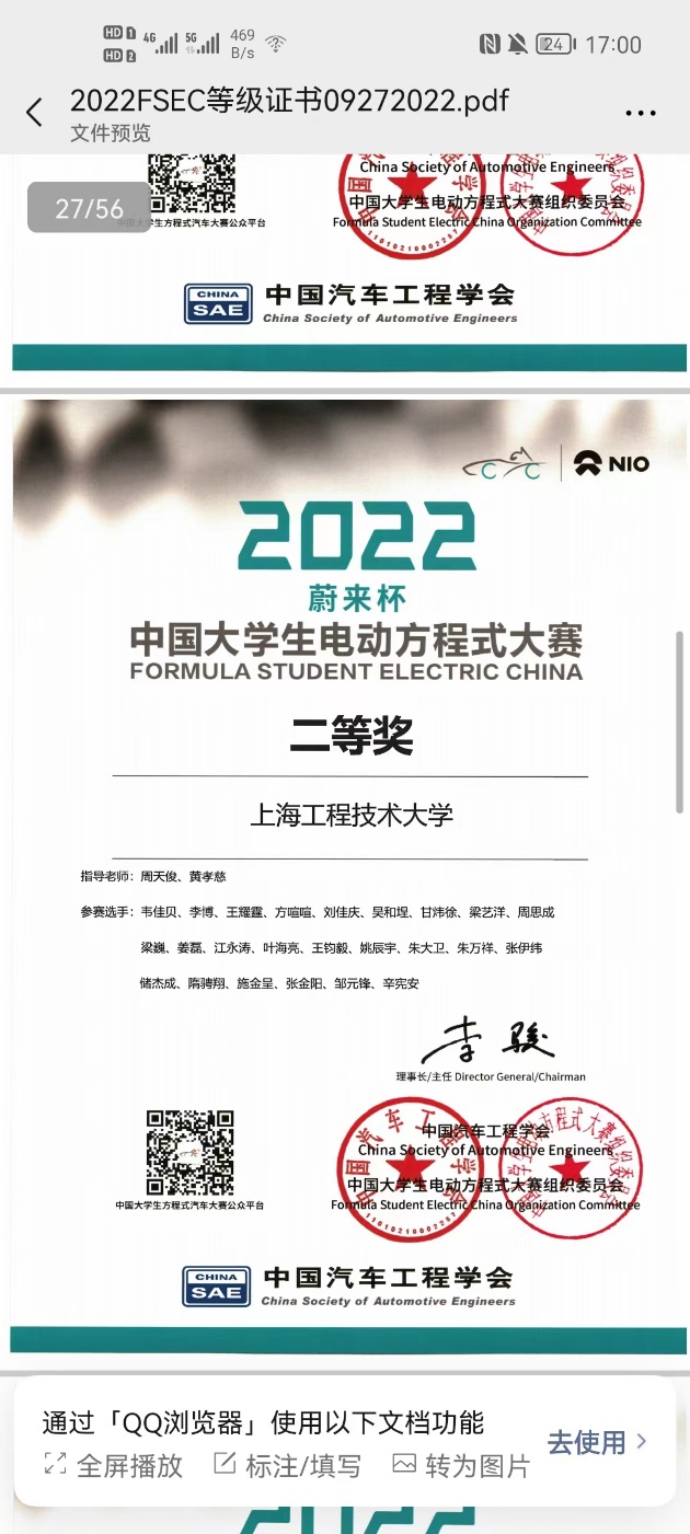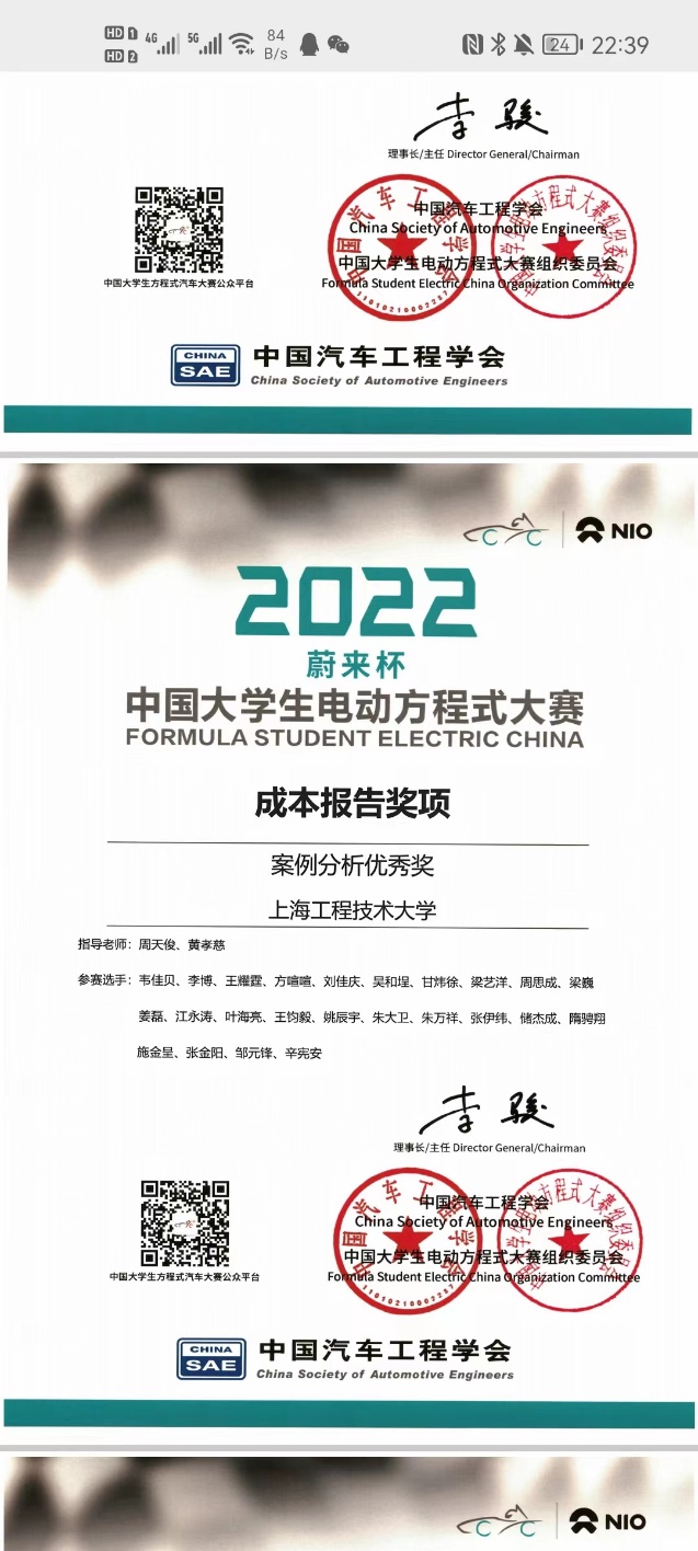 2022赛季是一个充满挑战的赛季,上半年的疫情给电动方程式车队带来不小的影响,全队上下被迫停止手上的一切工作,赛车无法得到日常的维护和升级。暑假期间,在车队指导教师周天俊老师和汽车科创基地负责人黄孝慈老师的指导下,选择留校的队员第一时间赶赴车房进行整备和清洁工作,他们每天在车房钻研赛车的技术问题,十分不易。令人意外的是,本在11月的比赛提前到了9月举行,刚到校的队员们只有两周的准备时间,他们没日没夜地整备赛车、争取将赛车调教到最佳状态。来到比赛前的第三天,突如其来的疫情又一次出了难题,车队被告知由于广富林地区被列为疫情高风险地区,无法参加线下赛事。不过队员们并没有为此灰心,经与组委会沟通后采用线上方式参赛。9月17日,各组队员聚集在车房,顺利完成了线上比赛。尽管没有线下赛的成绩,但依靠线上赛项的优异成绩最终仍然获得总成绩二等奖,为2022赛季画上一个完美的句号。